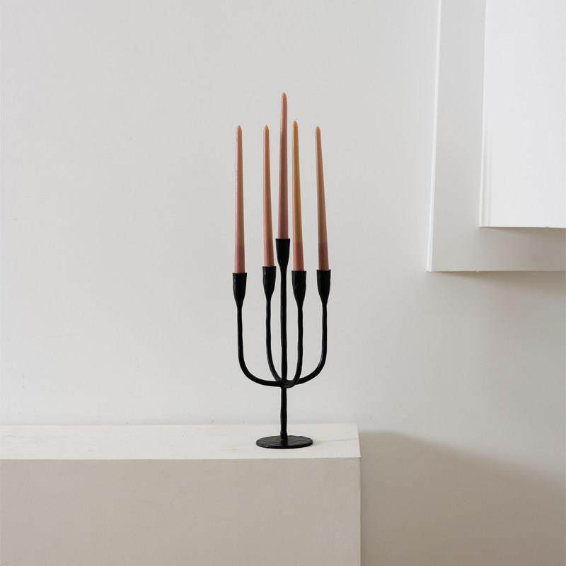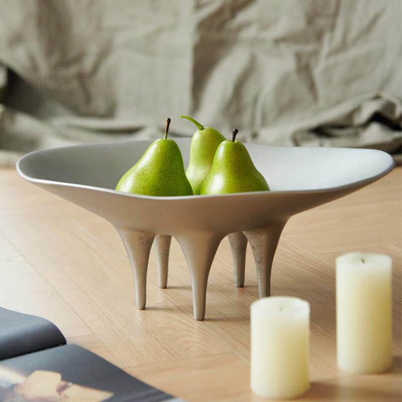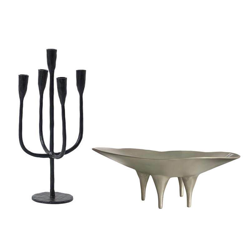 进口铝制黑色复古多头烛台摆件样板间酒店哑银元宝形带脚果盘装饰