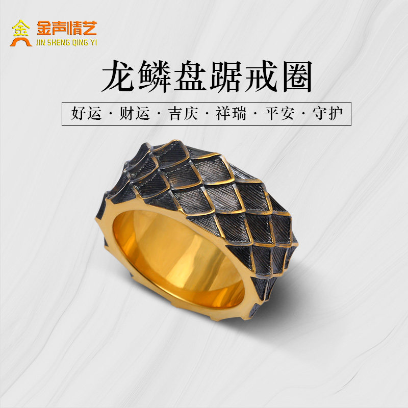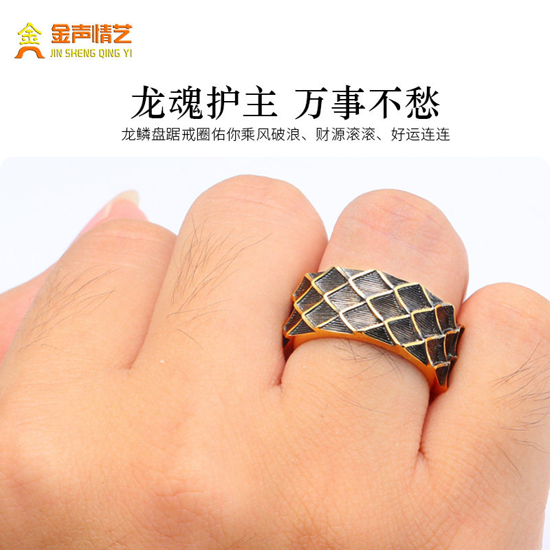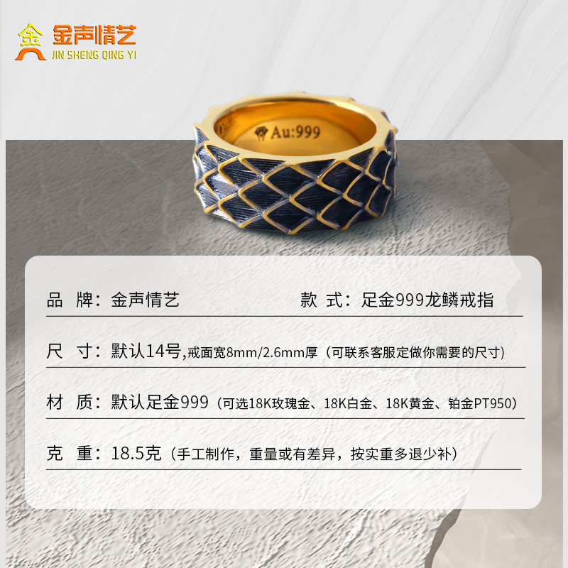 金声情艺黄金复古酷黑龙鳞戒指男女款 999足金龙生肖黑金工艺戒指