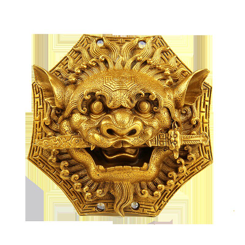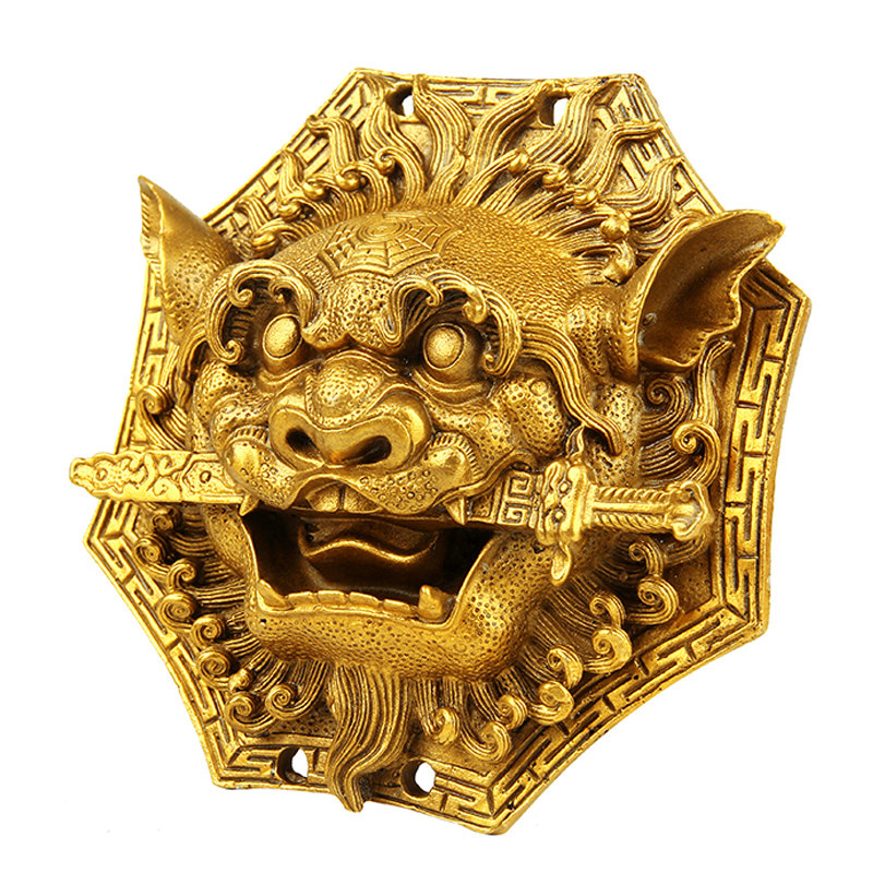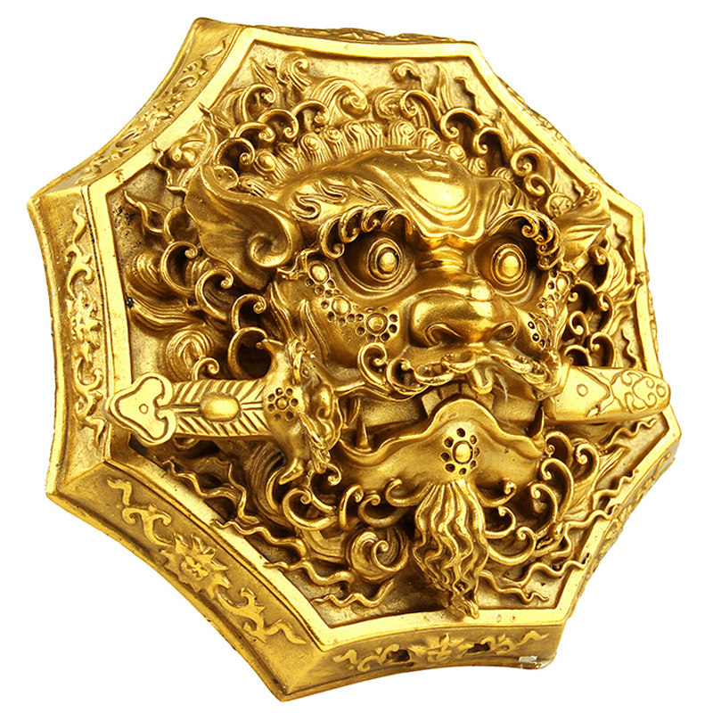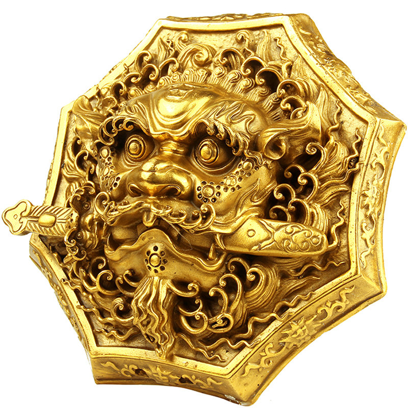 速发狮铜八角黄头摆件铜兽子八卦狮咬剑挂件铜狮头睚眦挂饰狮子头