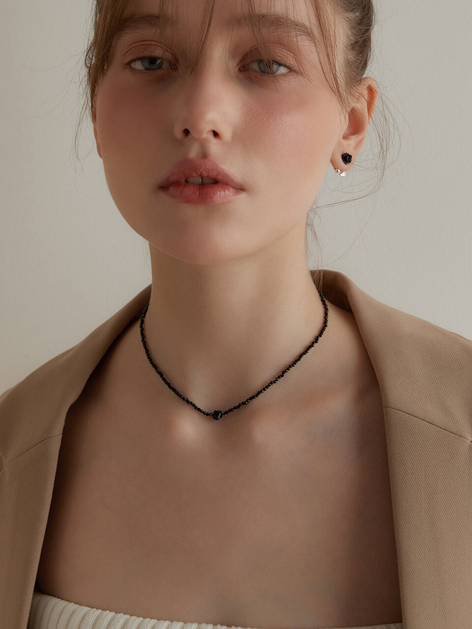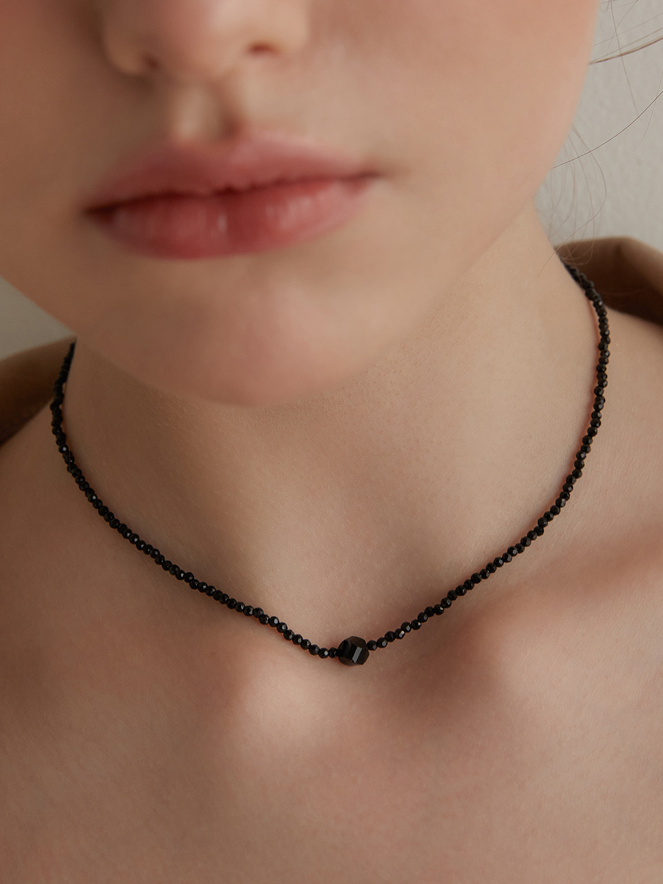 纯银天然黑色项链黑晶石切面珠超细迷你优雅简约黑尖晶银色锁骨链