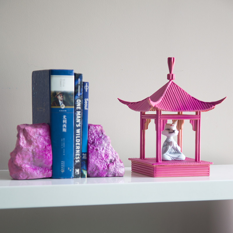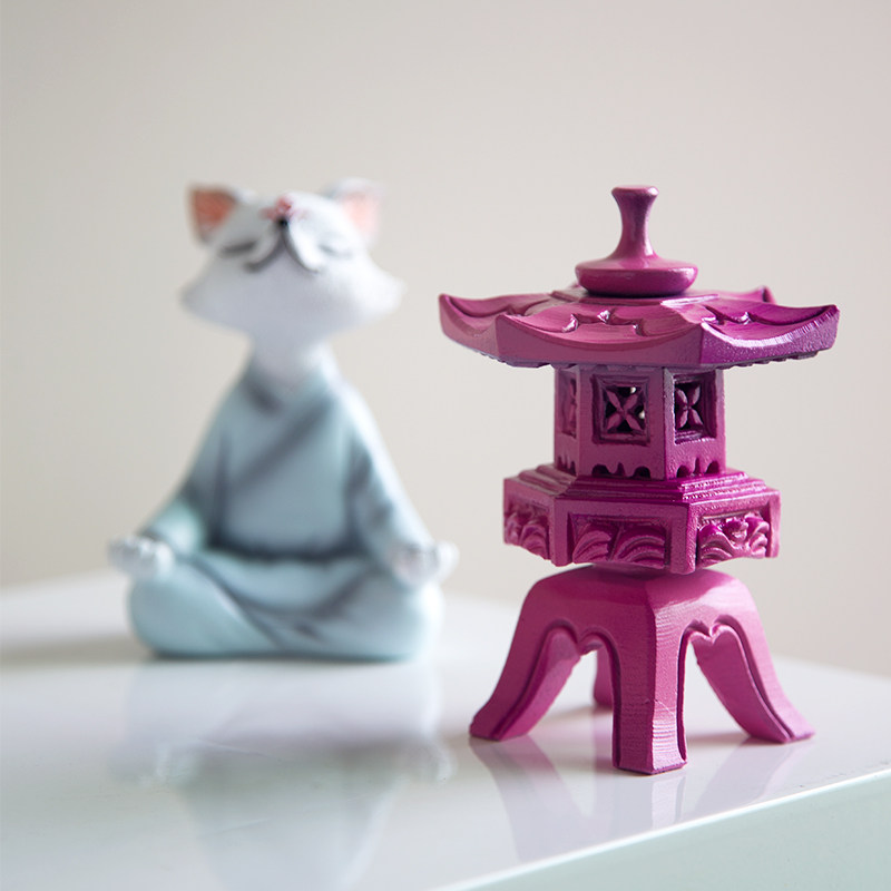 新中式打坐狐狸粉色建筑石灯书挡创意摆件家居玄关客厅电视柜摆件