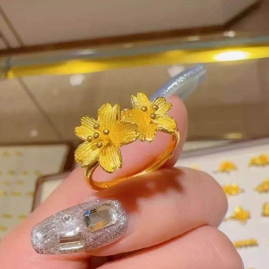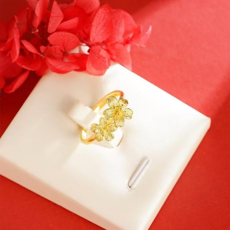 新款格桑双花金戒指女款金色时尚气质牡丹花戒指女士可调节指环