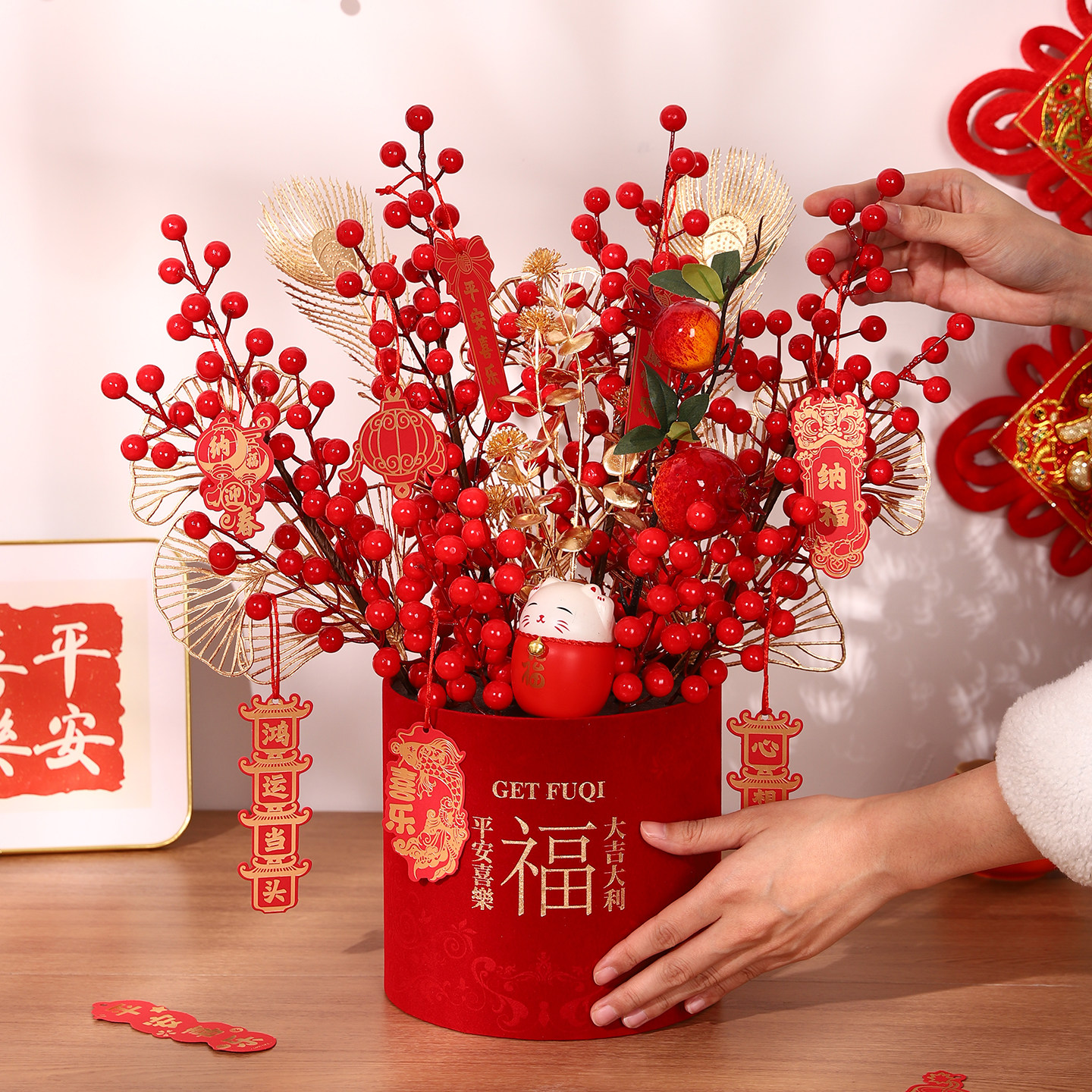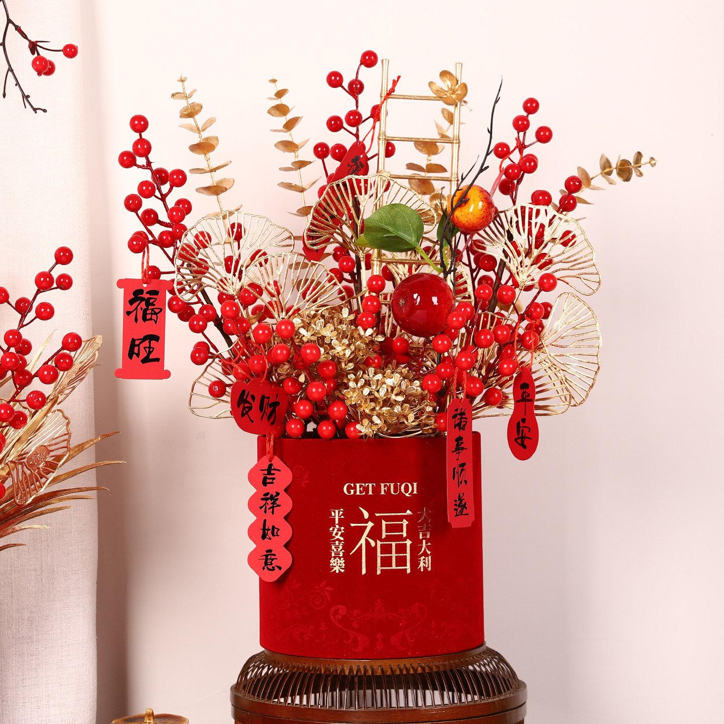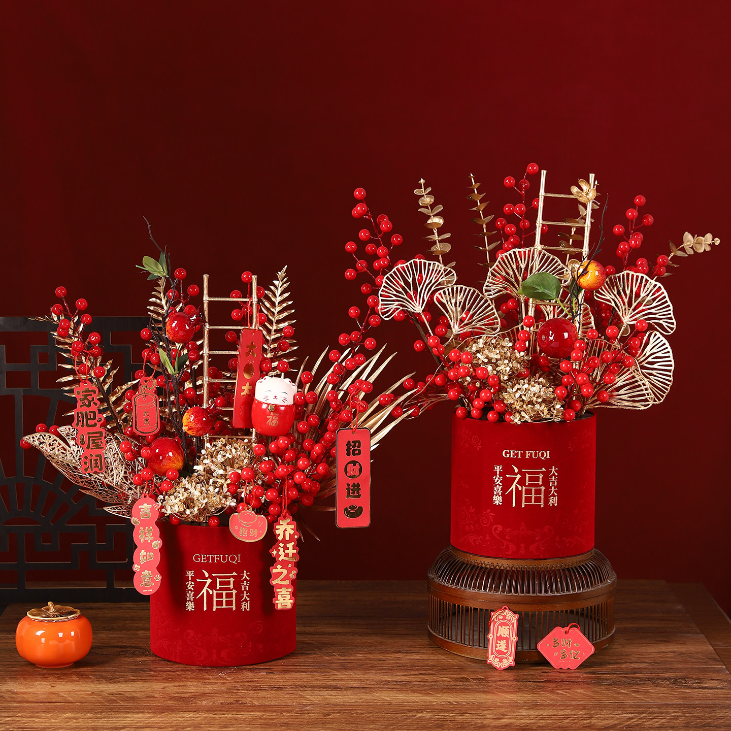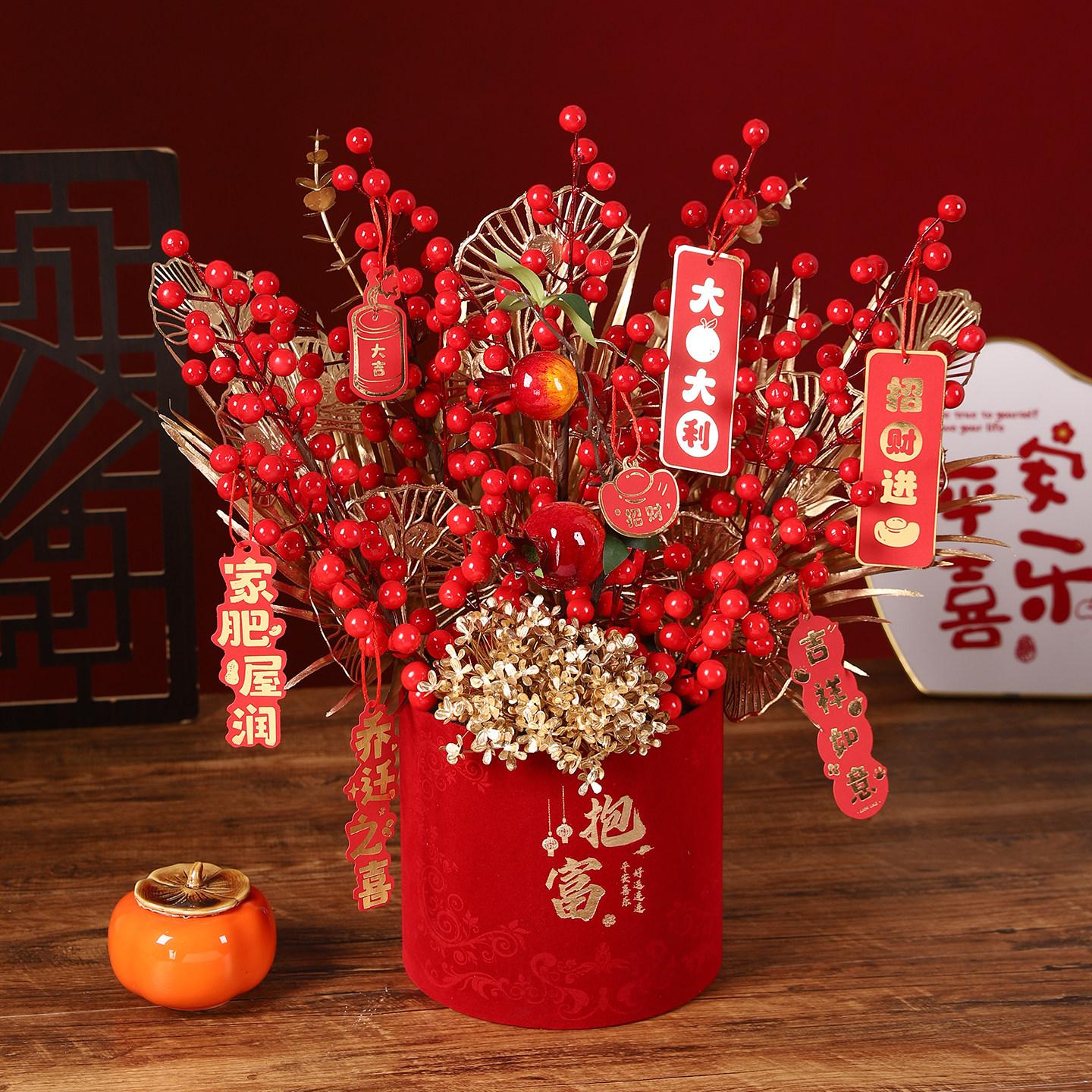 新年春节喜庆招财纳福发财果仿真花束红色福桶桌面装饰摆件乔迁礼