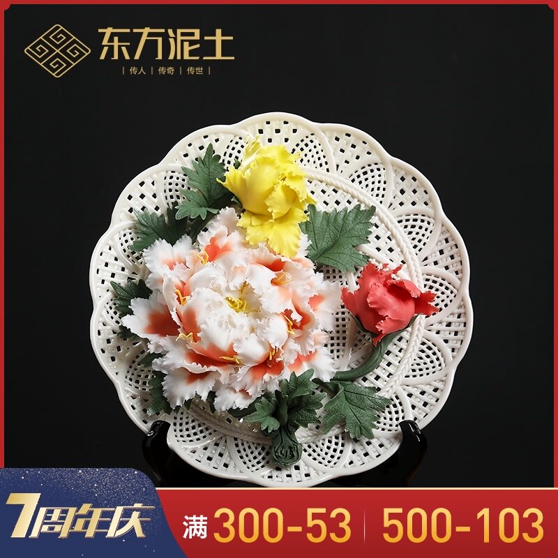 陶瓷手工牡丹花挂盘艺术摆件 新中式客厅装饰工艺品乔迁新居礼品