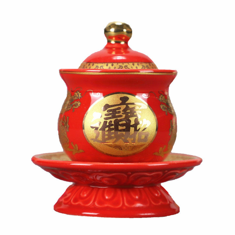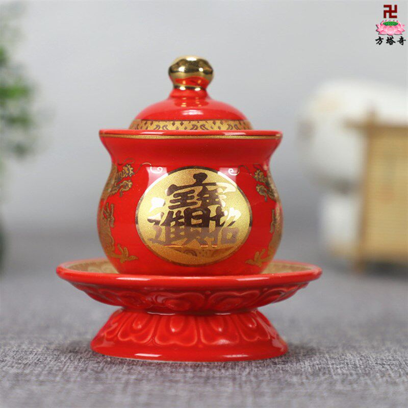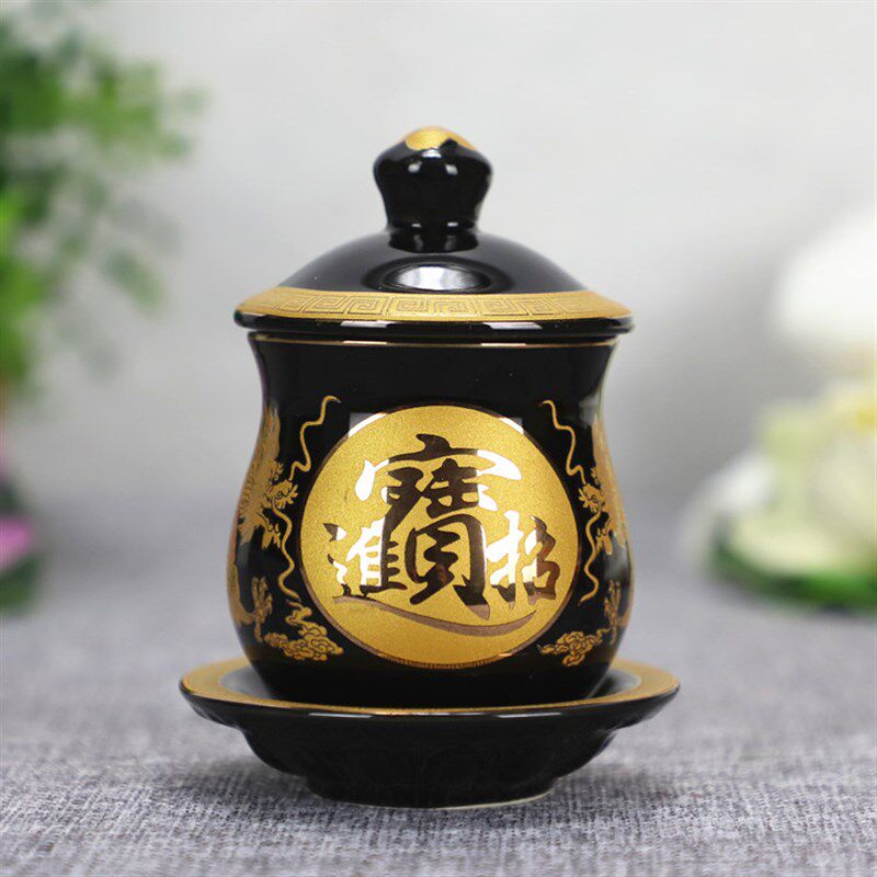 陶瓷招财进宝圣水杯黑色描金供水杯贡神杯贡佛杯净水杯佛具摆件