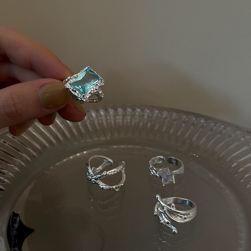 日韩925镀银蓝色方形戒指女复古时尚个性线条交叉开口指环食指戒