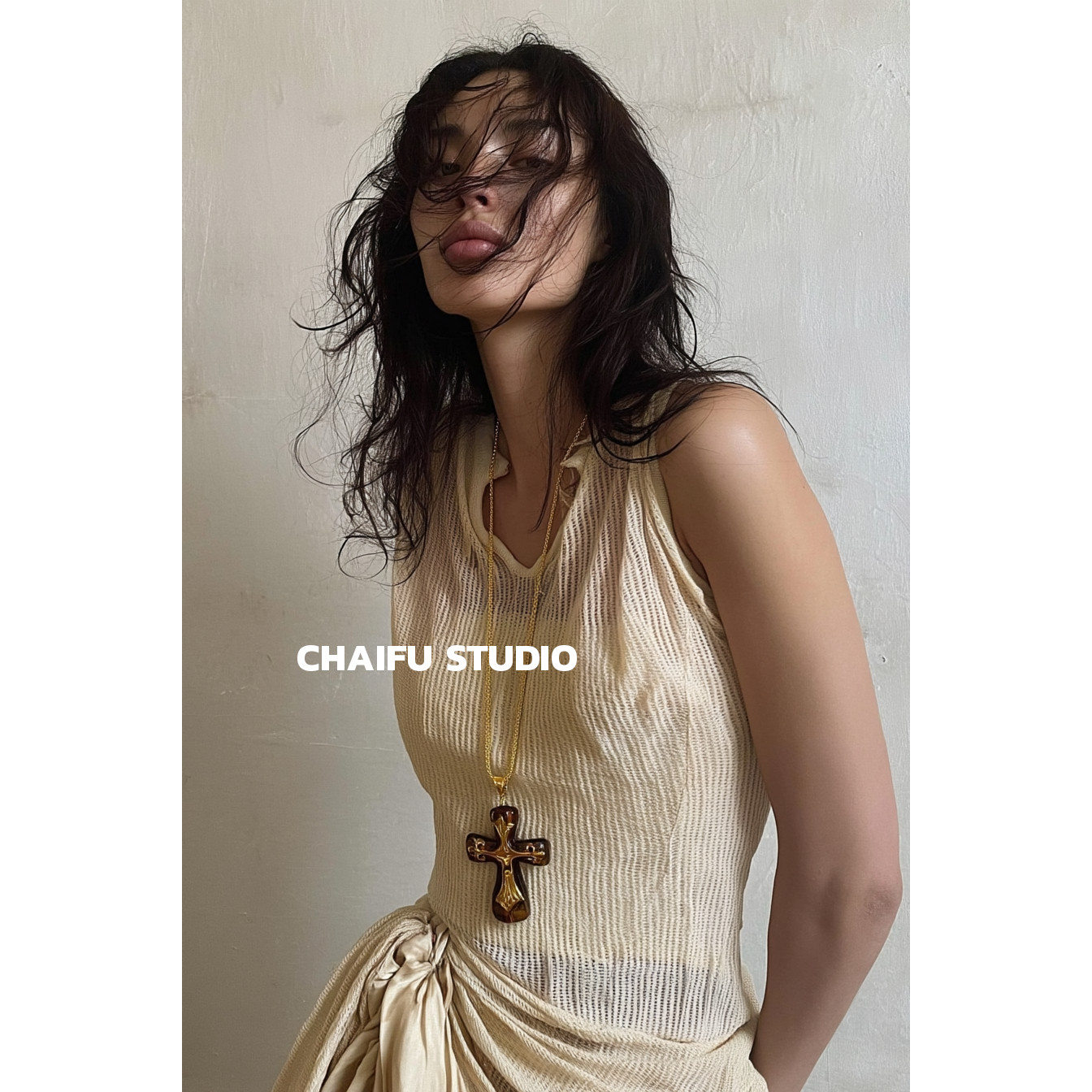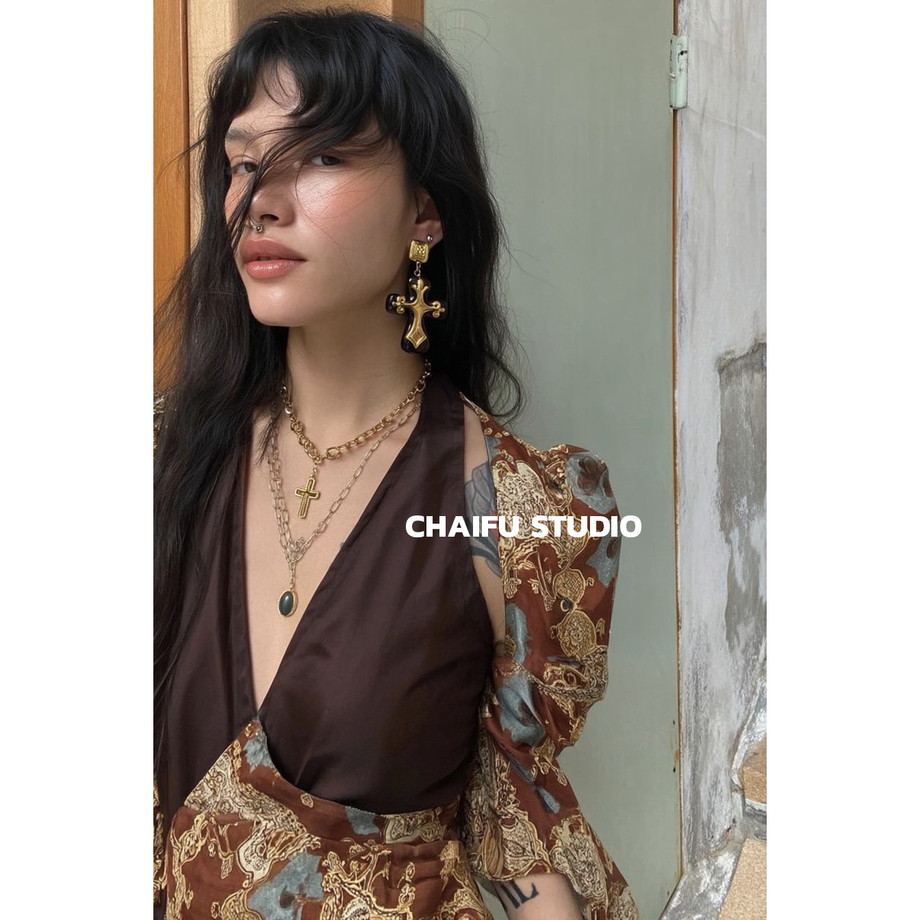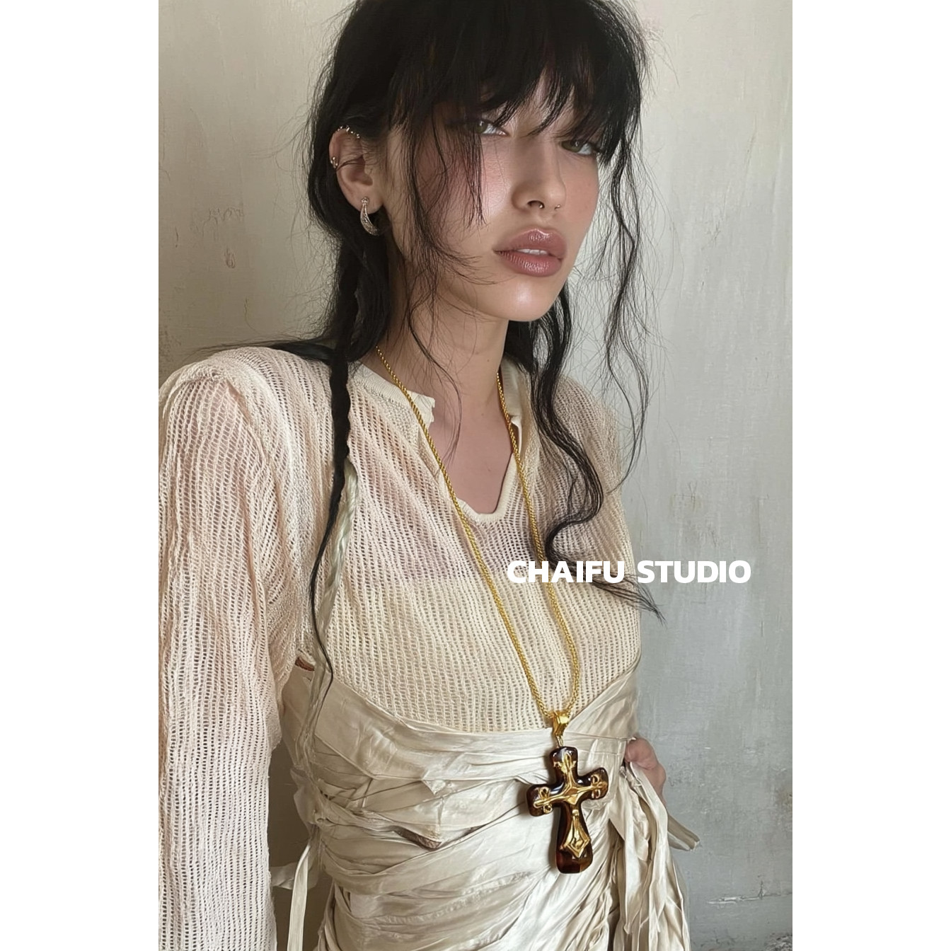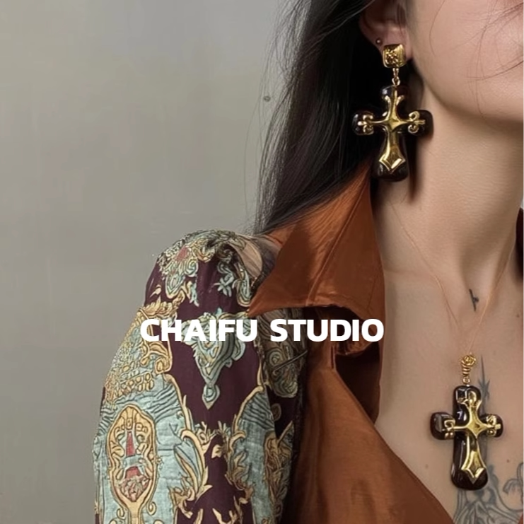 柴夫工作室/X136 欧美风夸张树脂十字架吊坠长链复古轻奢耳环套装