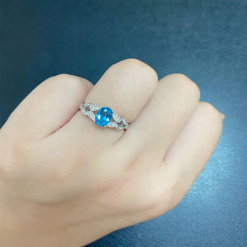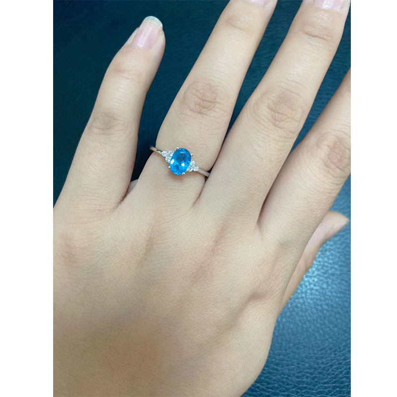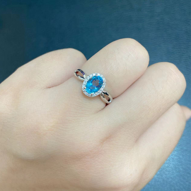 90元一件天然瑞士蓝托帕石戒指女 925纯银开口镶蛋形蓝色宝石指环