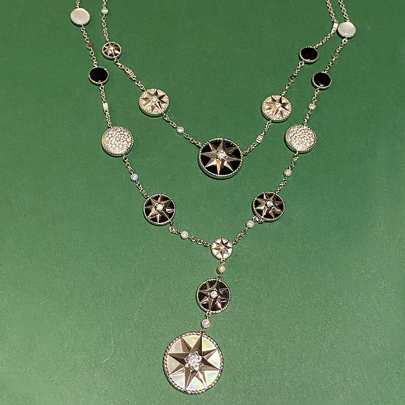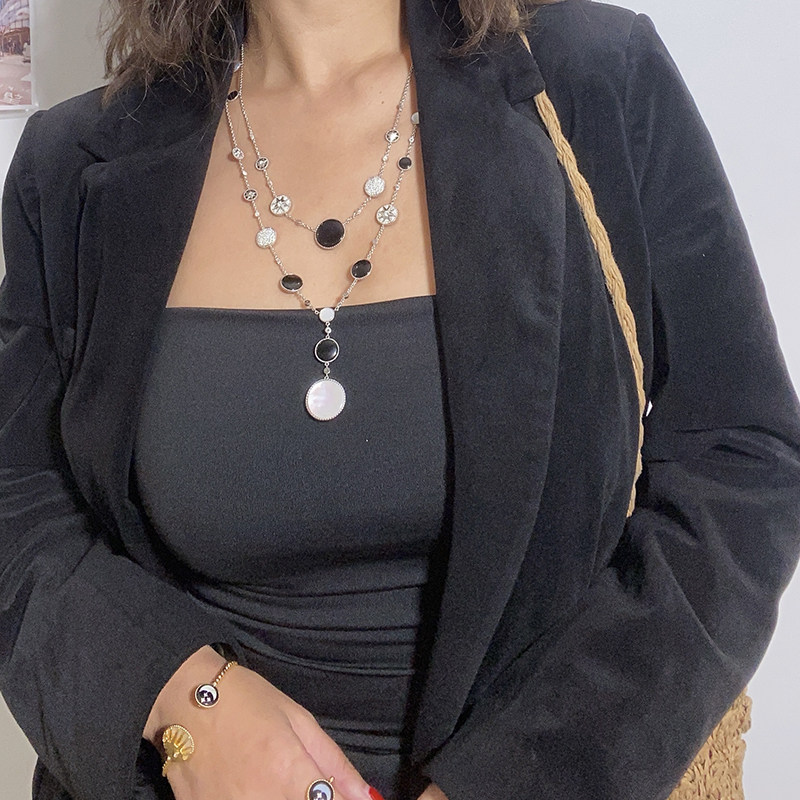 吾爱高端晚宴双层八芒星罗盘长项链女轻奢纯银镀白金黑白配毛衣链