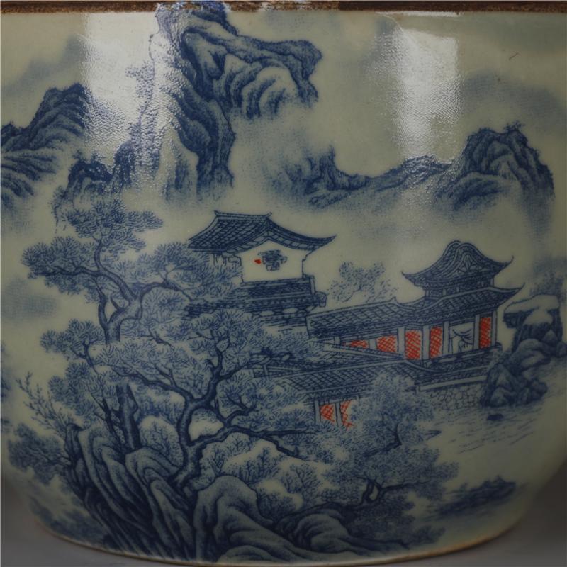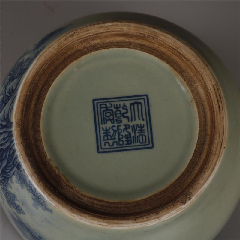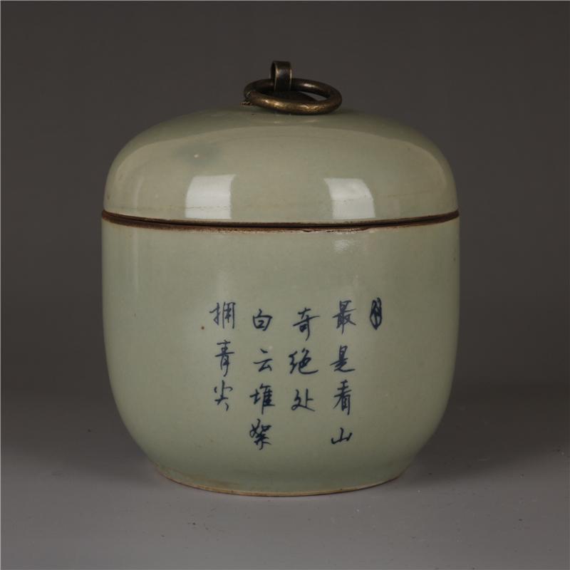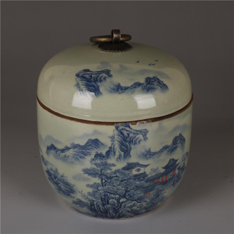 清干隆青花山水图江山多娇盖罐豆青釉仿古茶叶罐古玩旧货I民间老
