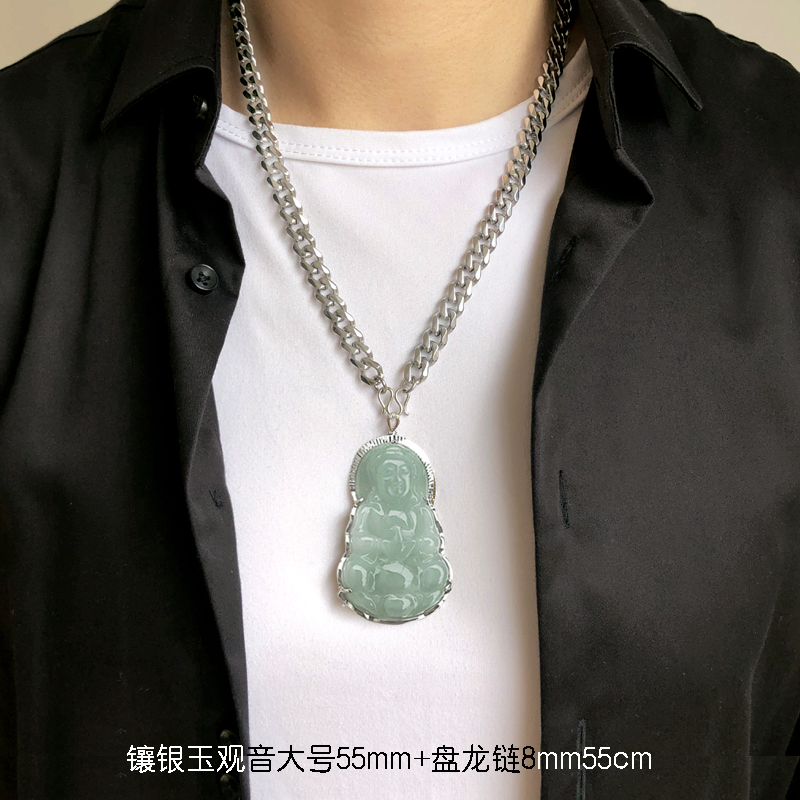 大观音吊坠男本命年项链佛珠挂件老坑糯种翡翠玉观音纯银镶嵌玉石