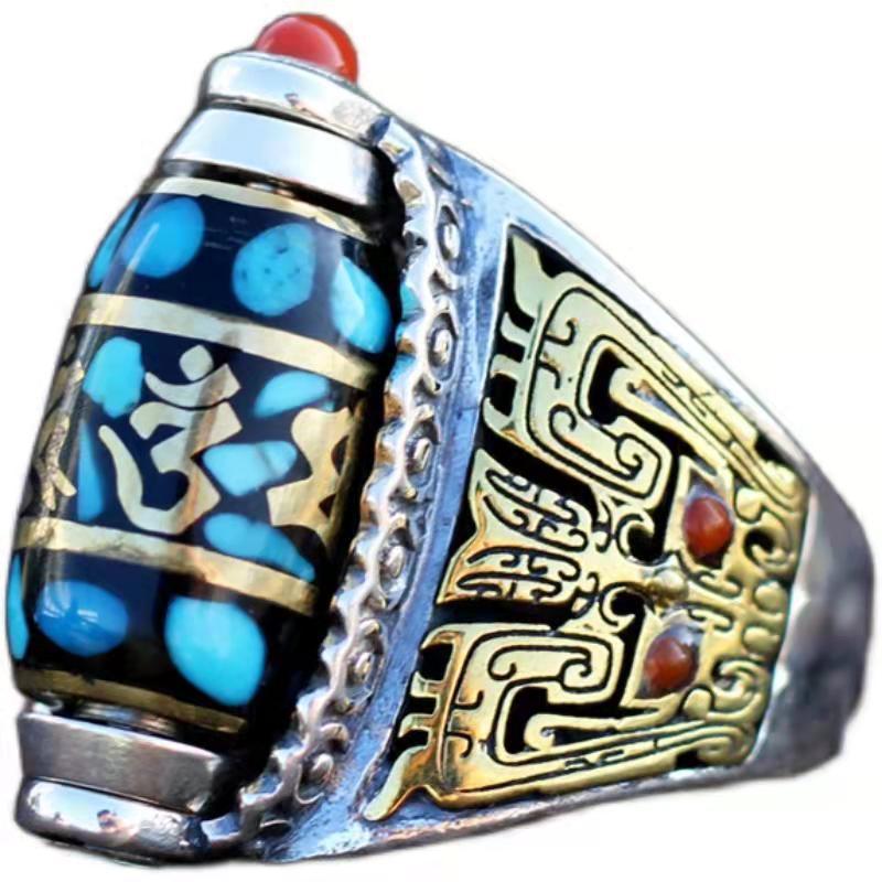 新品九眼天珠戒指藏式男女款夔牛大鹏饕餮纹六字真言复古食指戒指