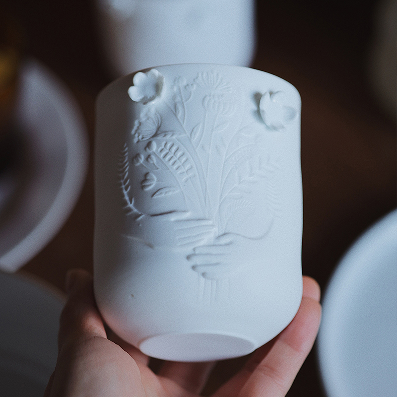 收集时光 超薄精工 德单高温白陶手捧花浮雕收纳筒花瓶工艺摆件