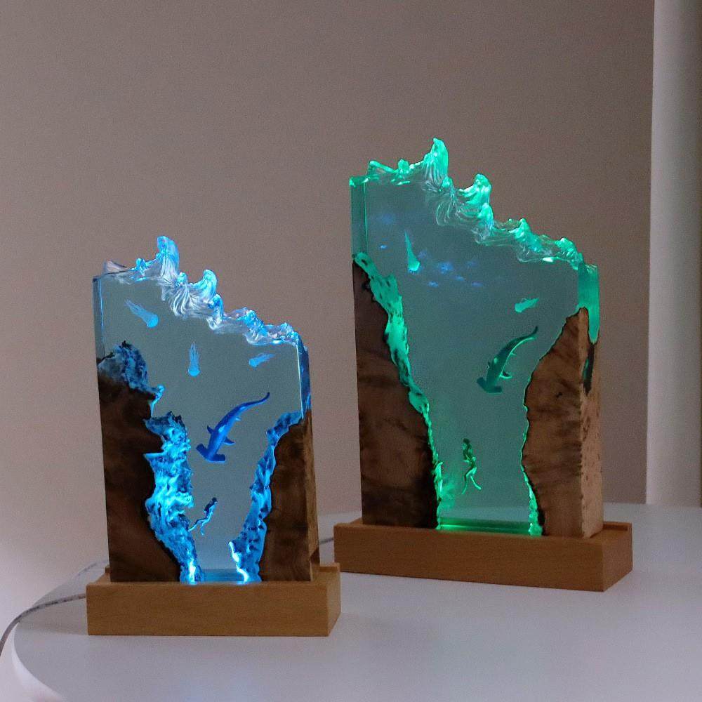 海洋系列美人鱼锤头鲨桌面办公室艺术摆件海龟水母实木礼品树脂灯