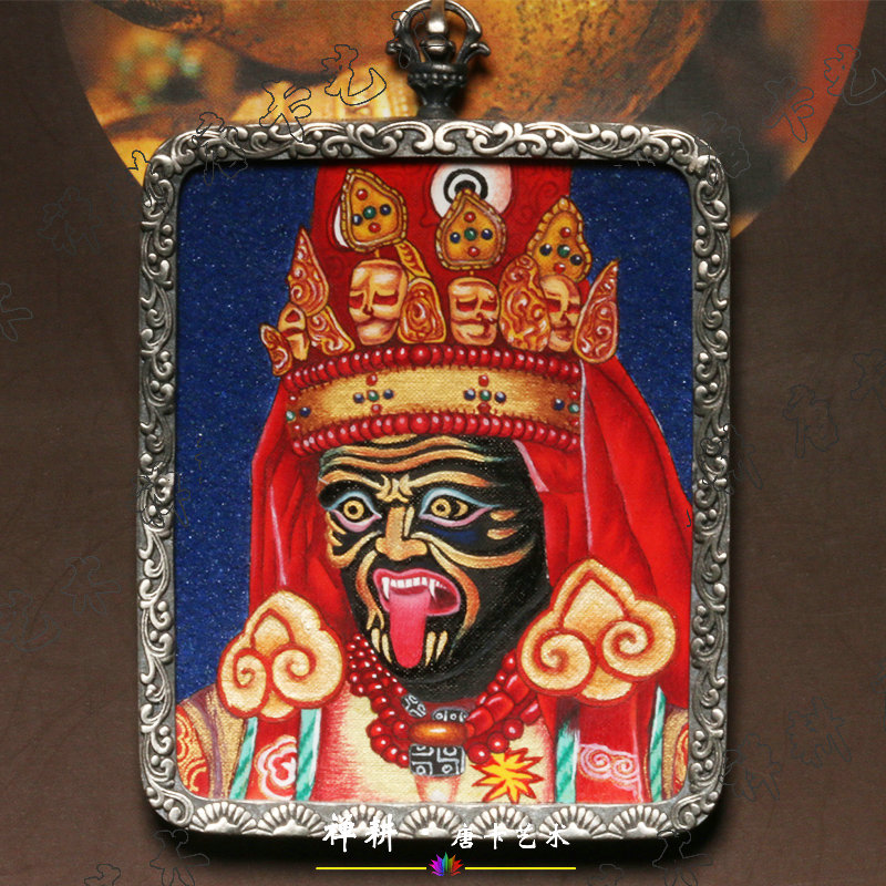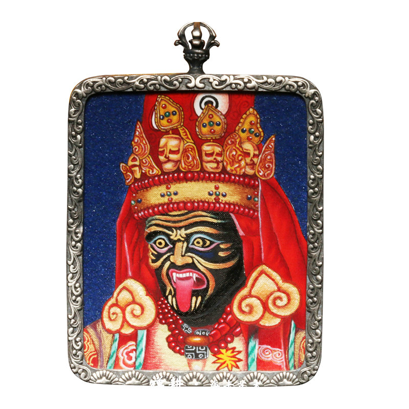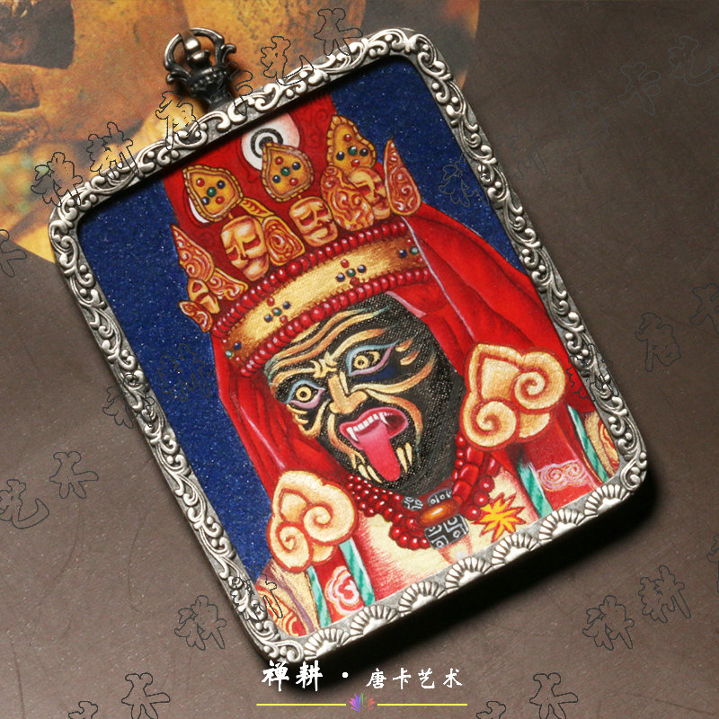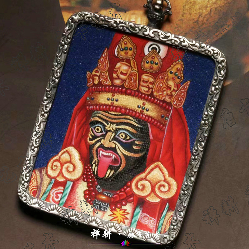 手绘热贡随身微唐写实扎基彩唐吊坠银壳布本矿料粗矿背景