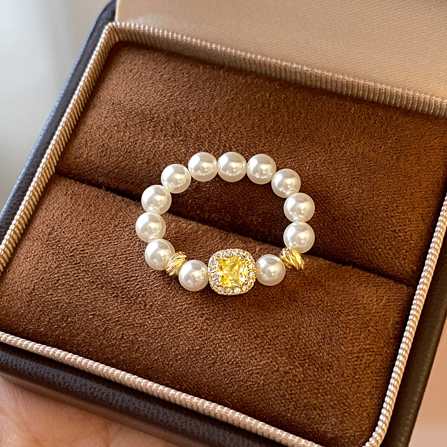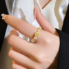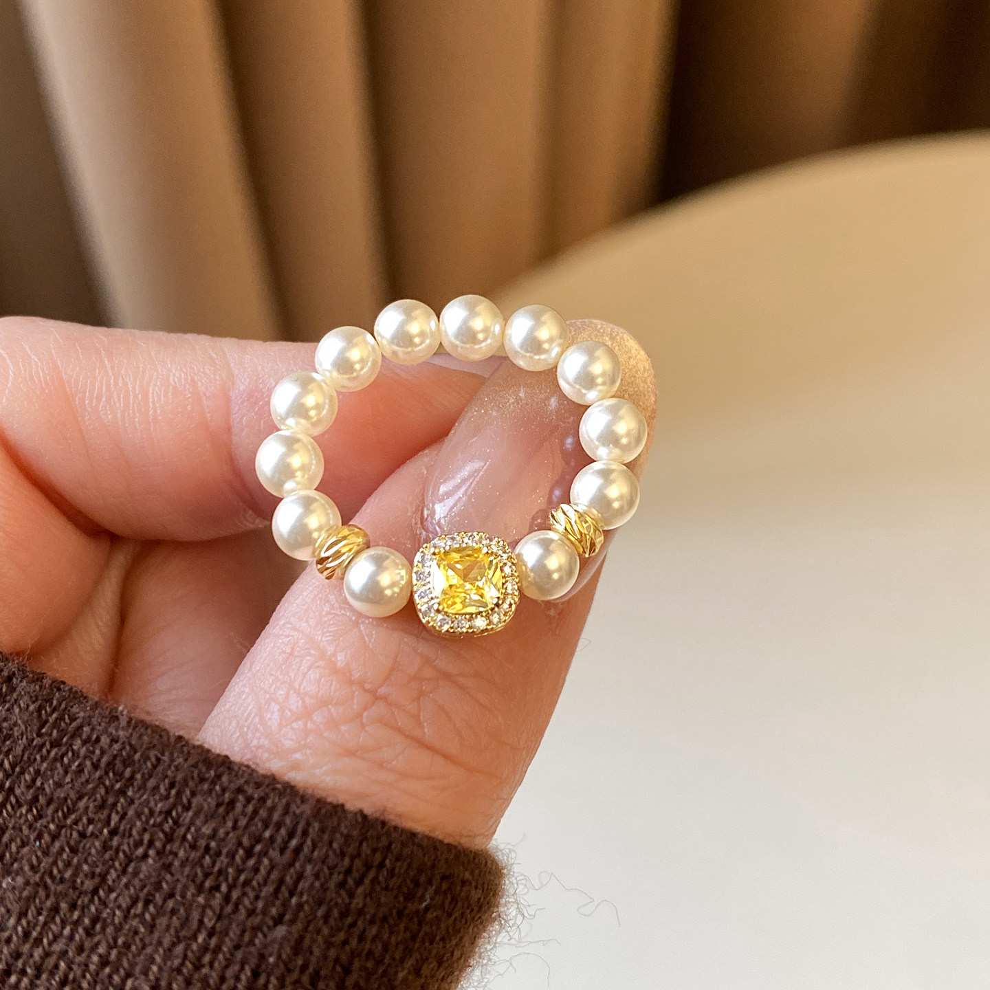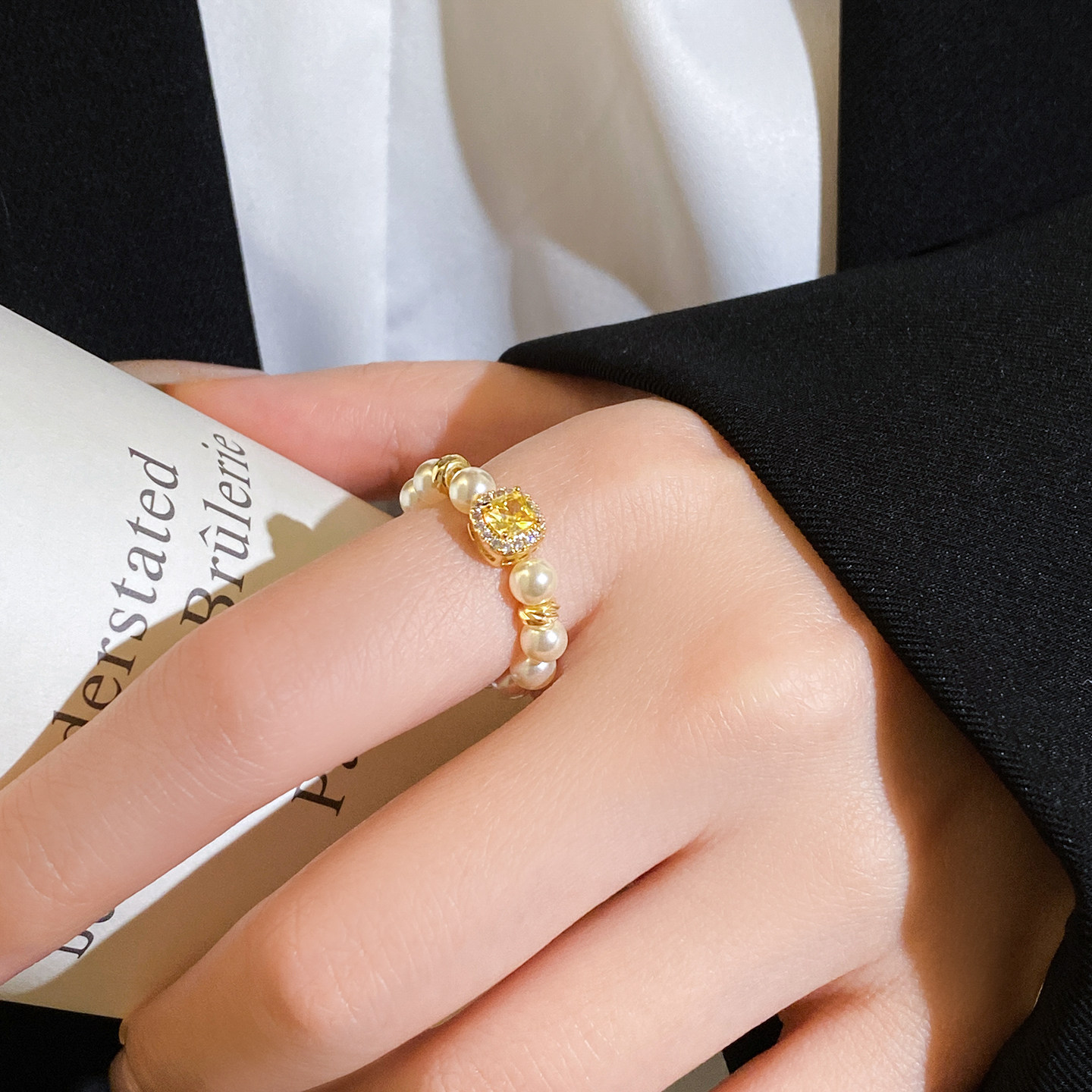黄色方形锆石珍珠串珠食指戒指女2026新款爆款轻奢高级感尾戒指环