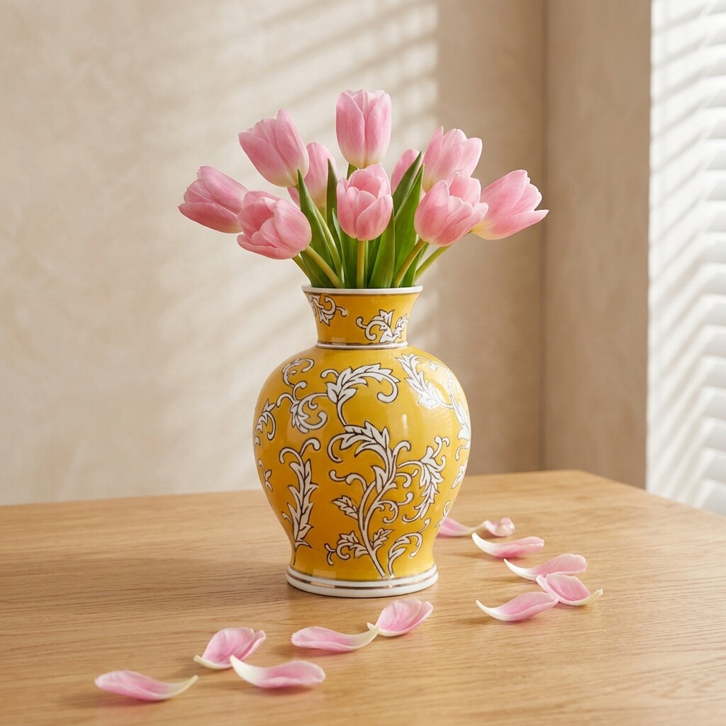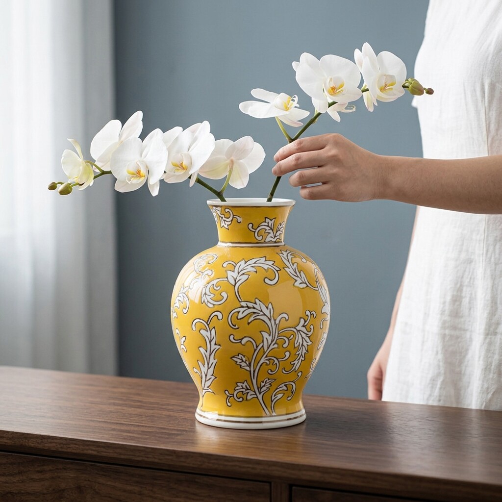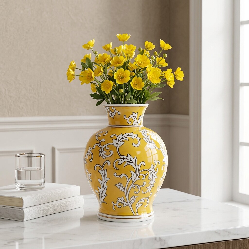 景德镇陶瓷花瓶黄色手绘花纹客厅插花摆件家居装饰品