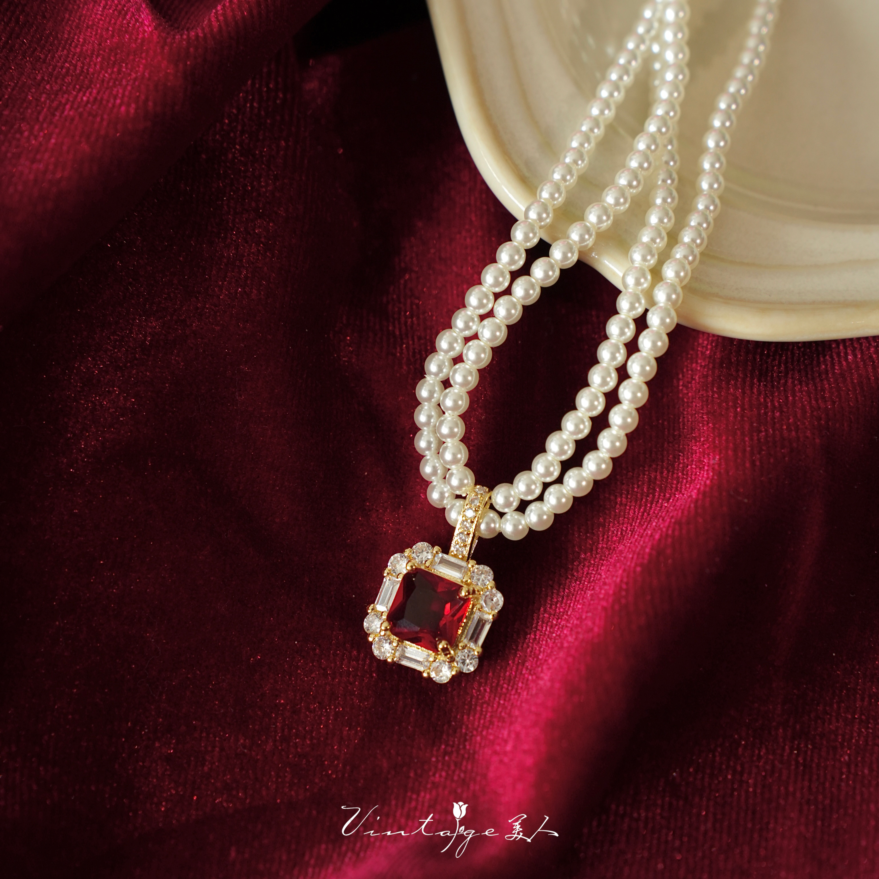「巴黎酒会」法式轻奢高级感复古闪耀酒红锆石双层珍珠项链锁骨链