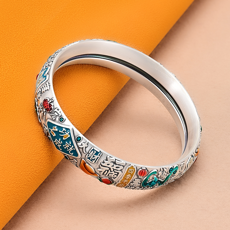 足银999珐琅彩银手镯闭口吉言银手镯新中式传承浮雕镯子送礼女款