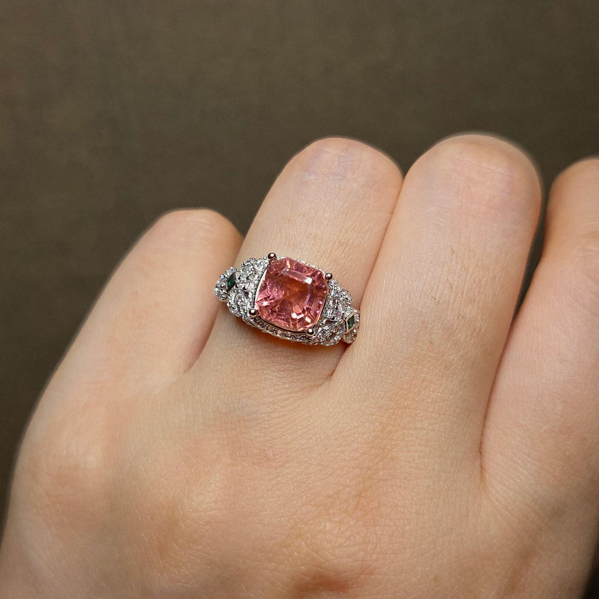 天然粉碧玺戒指方形阿斯切切割3.19克拉8mm帕帕拉恰蓝宝石的颜色