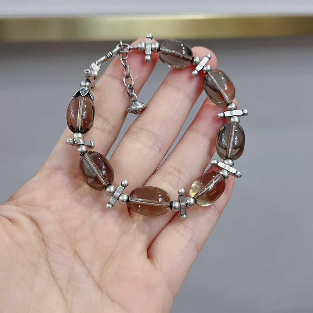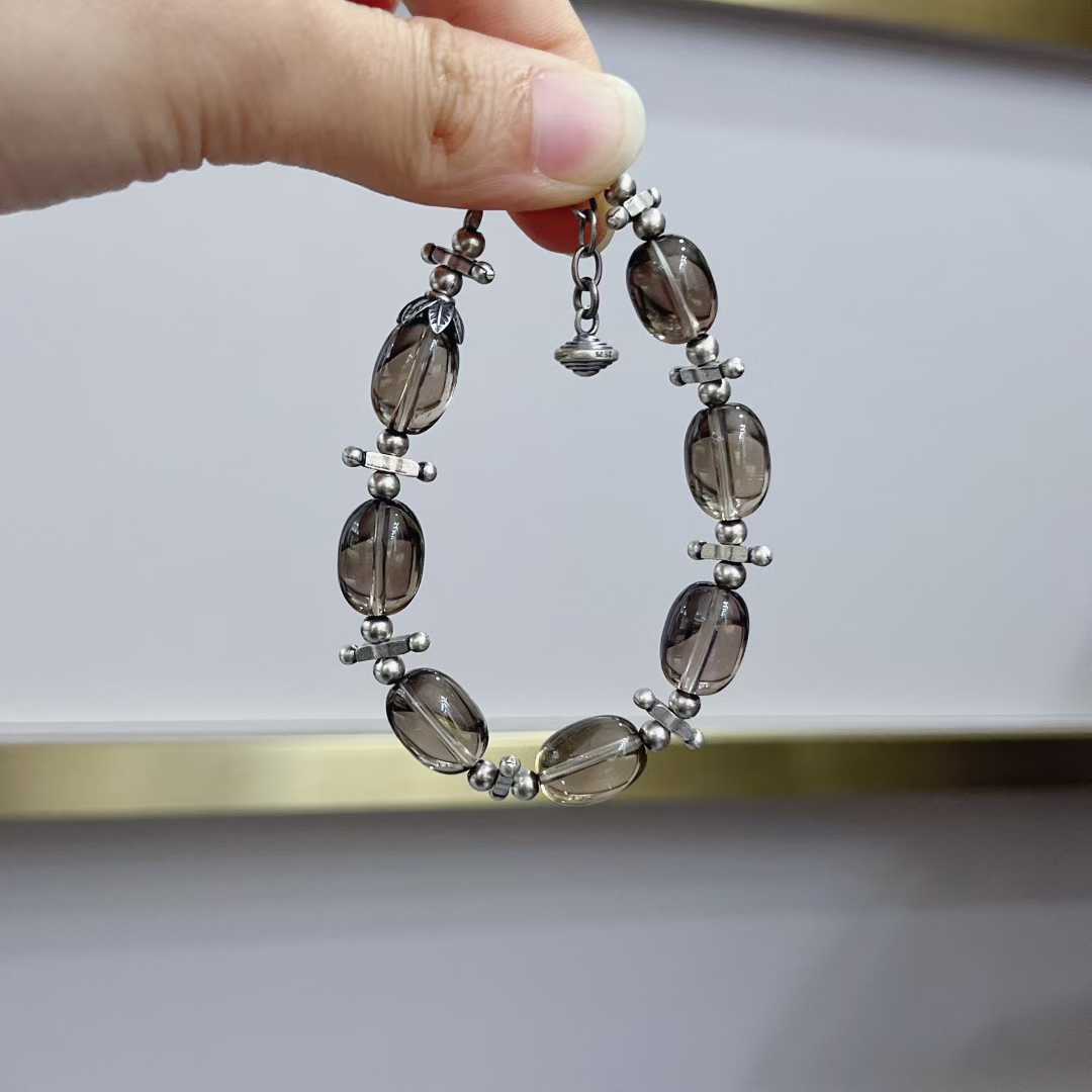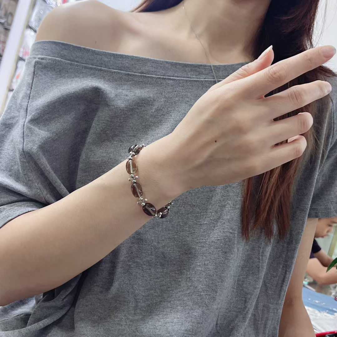 黑色水晶串珠手链天然茶晶手串女士设计感纯银配珠链条饰品女首饰