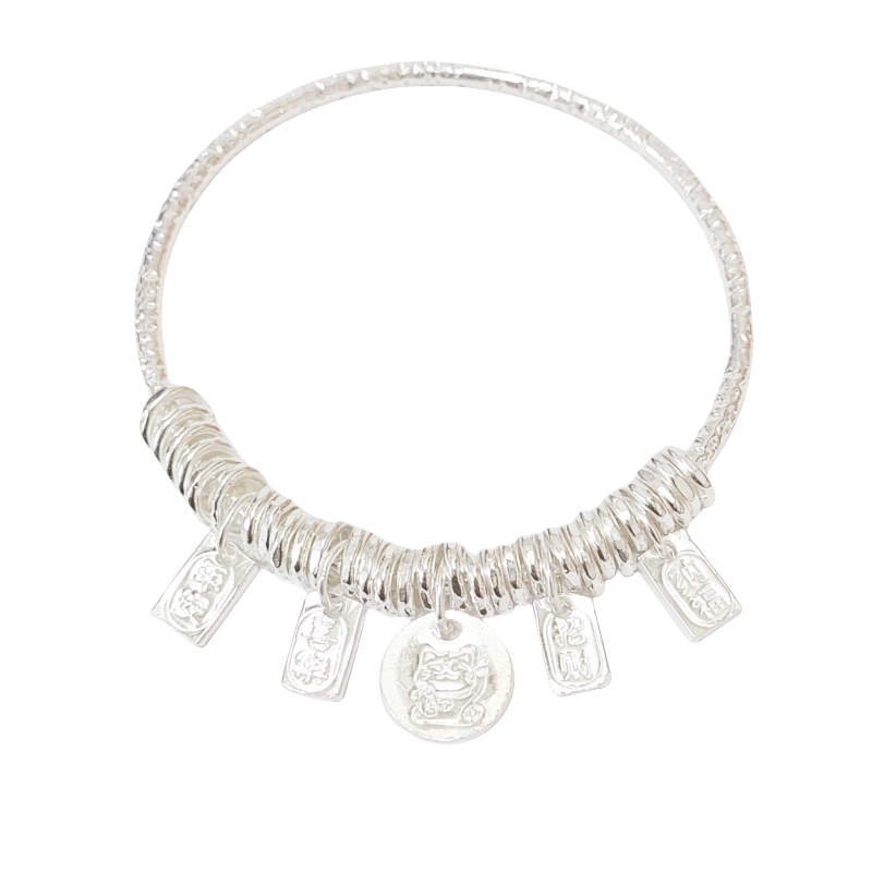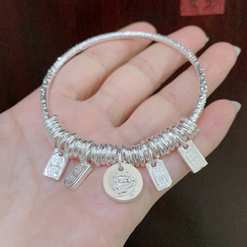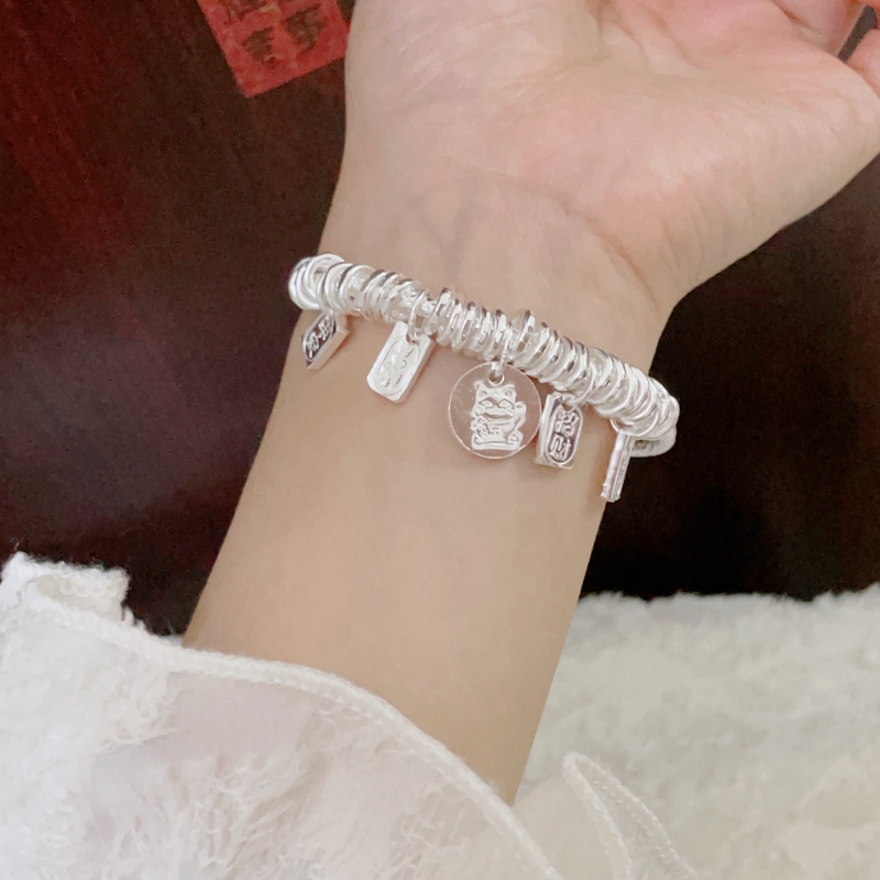 盘缠吉言银手镯女足银999串珠平安喜乐招财猫银镯子生日女友礼物
