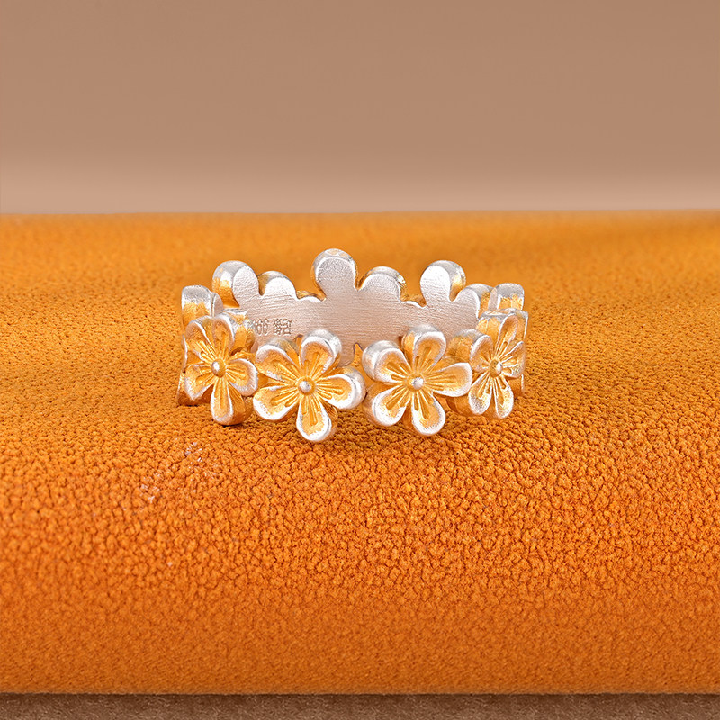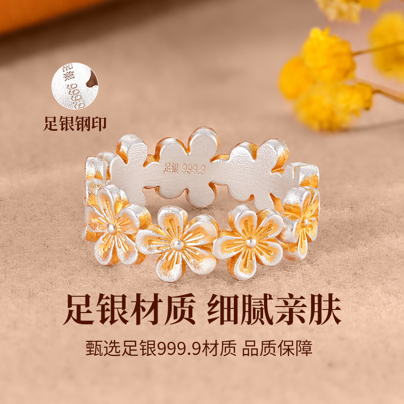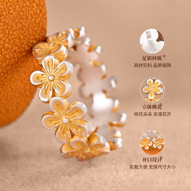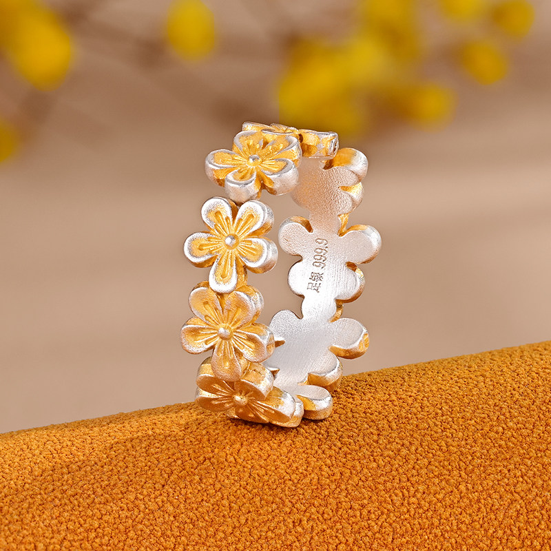银千造 小桃花戒指足银999描金花朵实心开口银戒指女款个性银指环