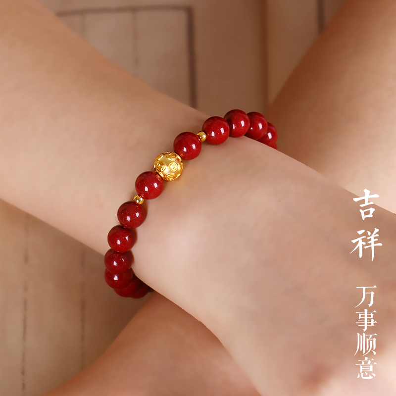 5D黄金足金铜钱手链男士钱币转运珠朱砂手串女饰品送女友新年礼物
