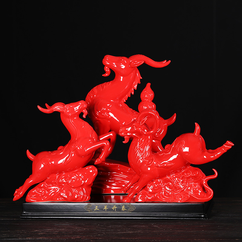 红色陶瓷三羊开泰摆件生肖羊招财开运领头羊客厅桌面电视柜装饰