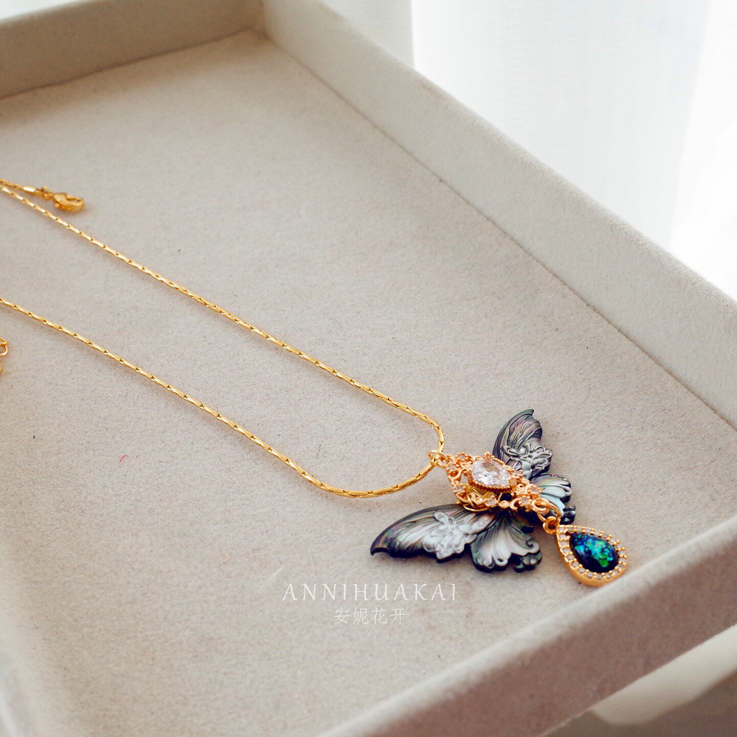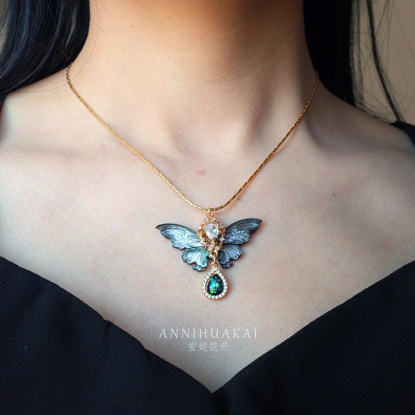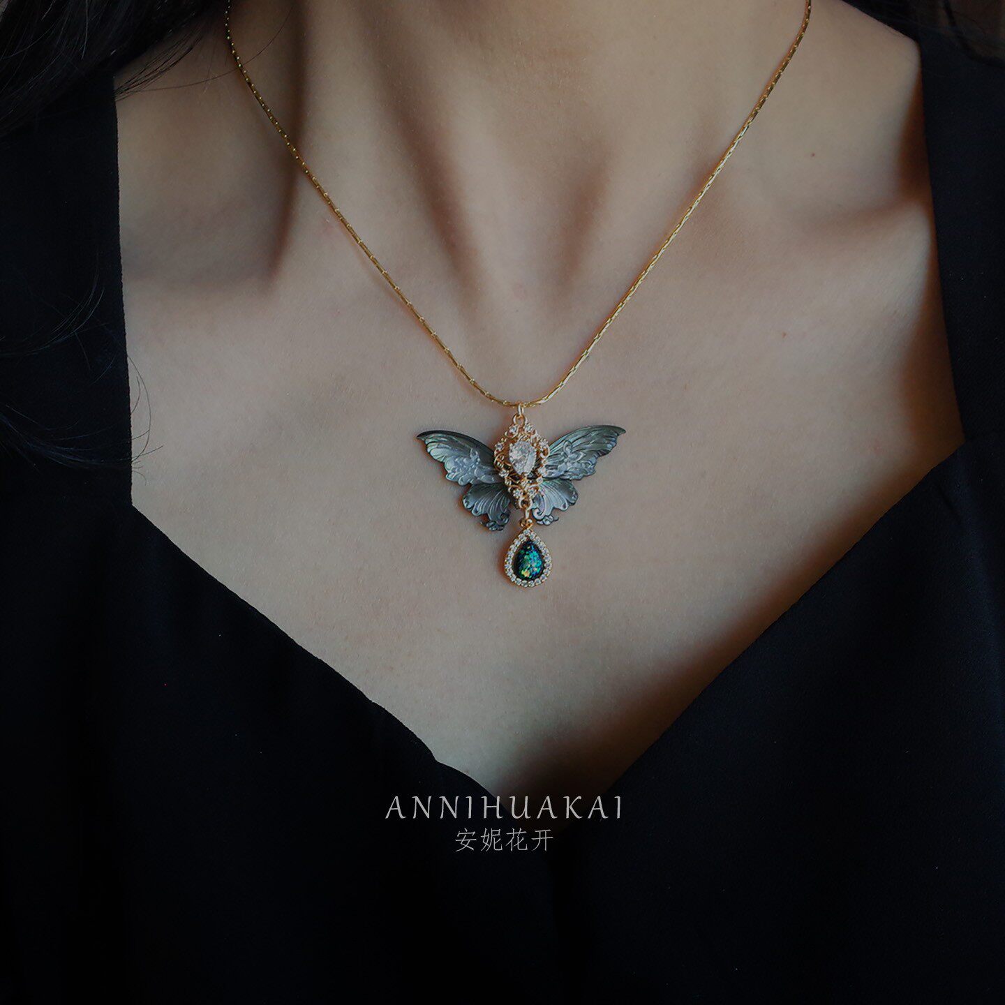 【玄蝶】安妮花开原创设计文艺复古黑色幻彩蝴蝶黑蝶贝蛇骨链项链