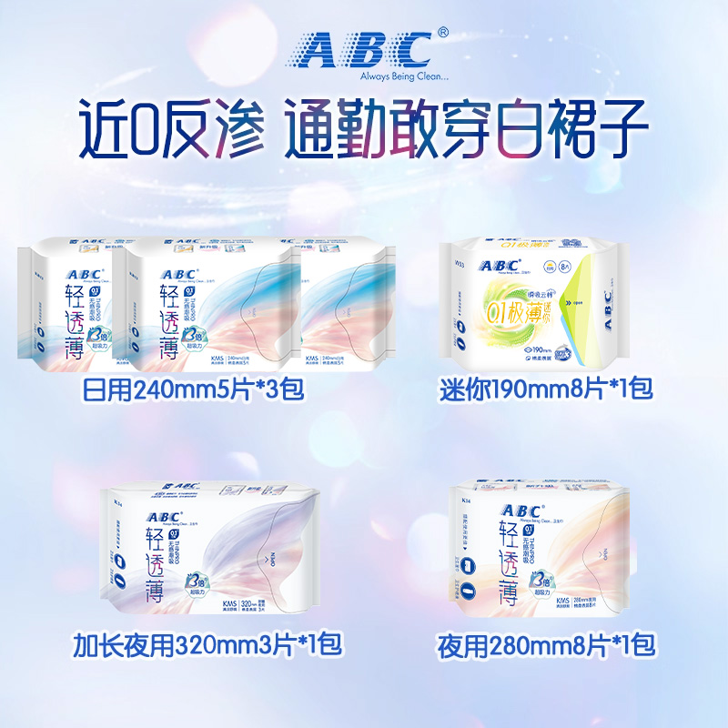 abc正品官方旗舰店卫生巾透气KMS轻透薄纯棉日用夜用姨妈巾6包A1