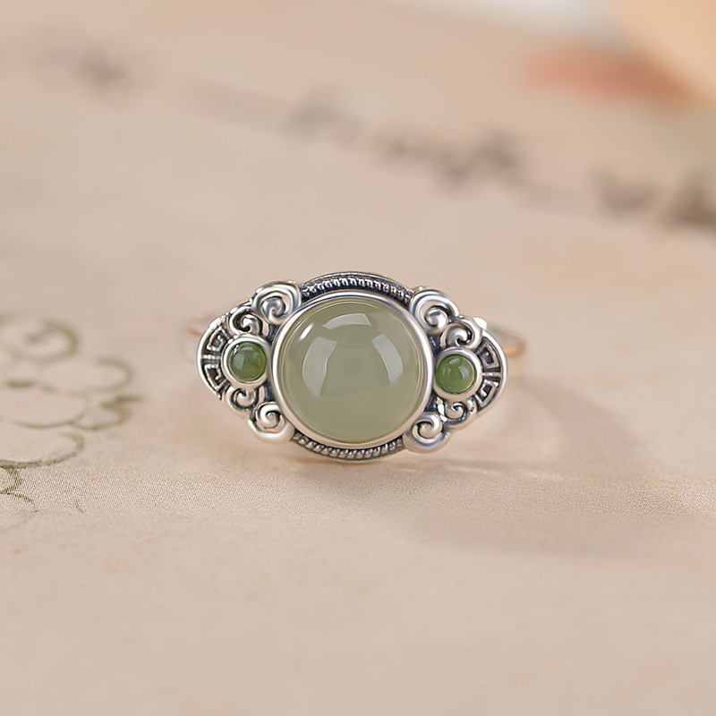 国潮复古吉祥如意碧玉藏银戒指女士个性卷云花边开口饰品指环礼物