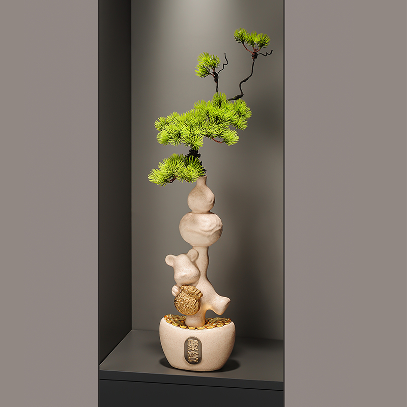 元宝葫芦迎客松熊玄关电视柜落地竖高细长橱柜摆件开业礼物新中式