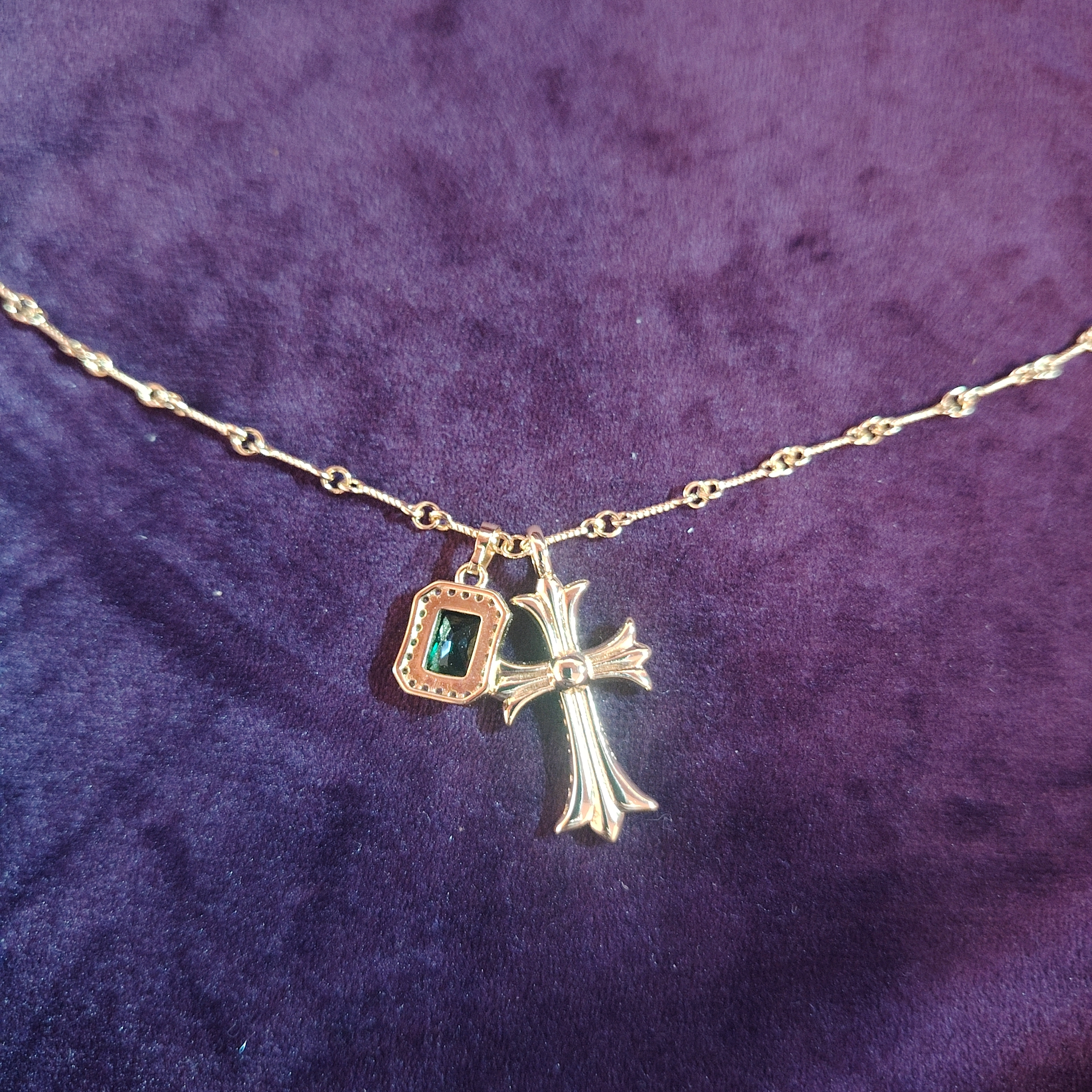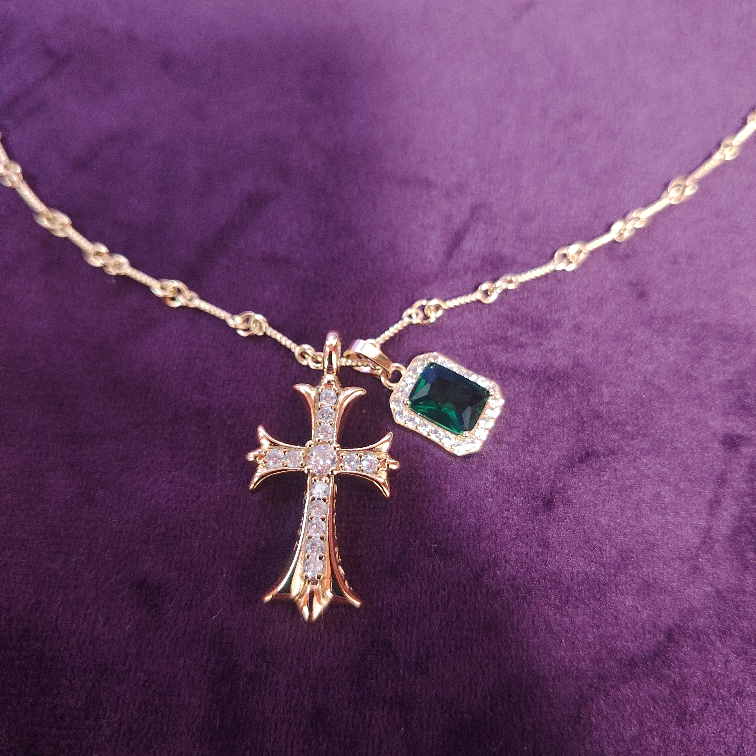 意大利中古定制925银镀金满钻十字架祖母绿双吊坠项链