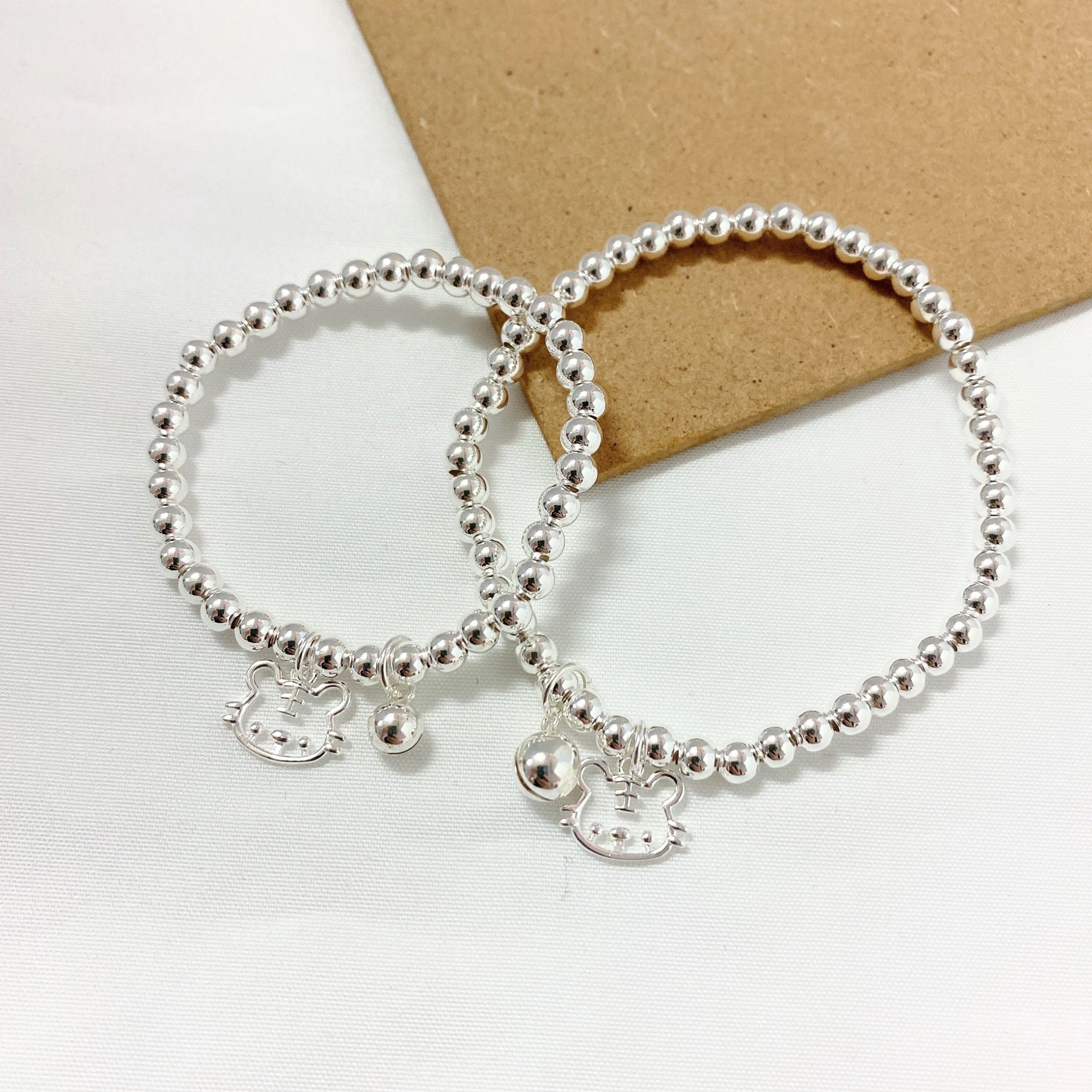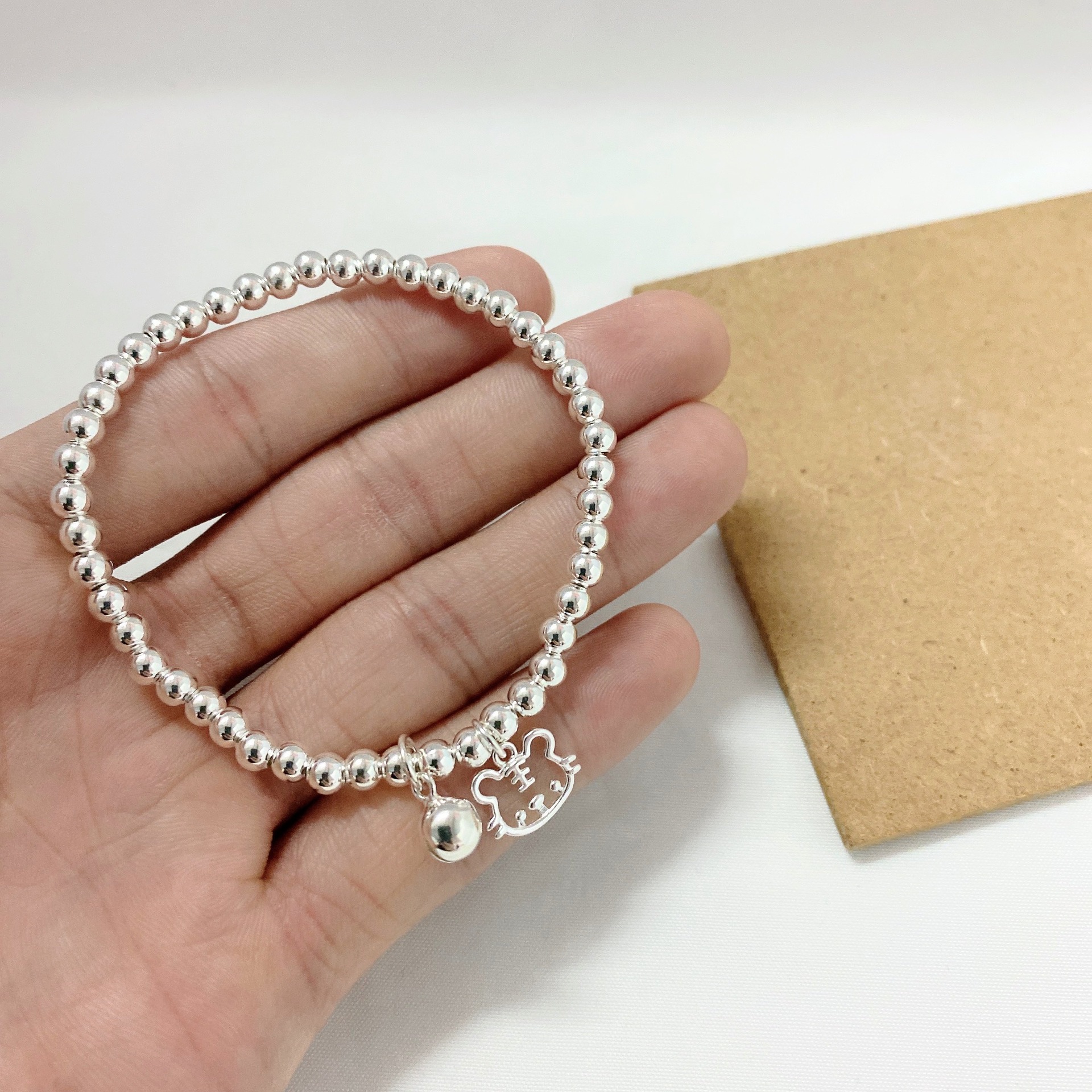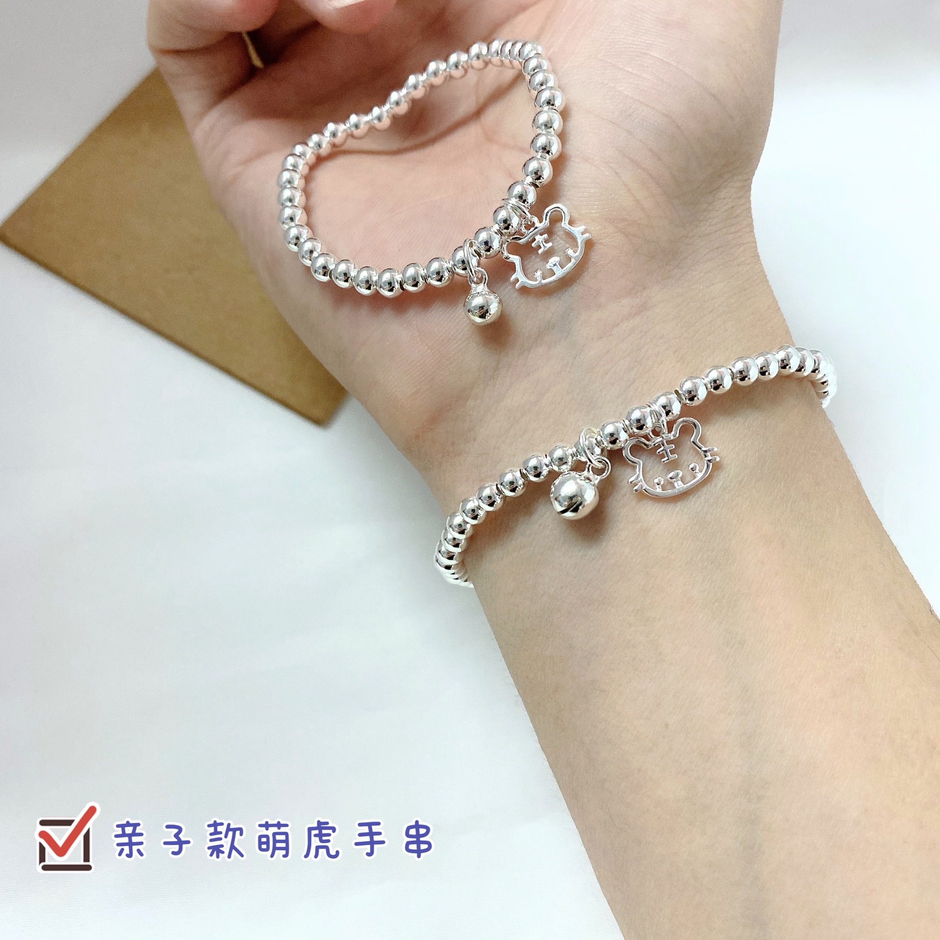 香港正生纯银S925纯银光珠招财萌虎铃铛亲子款手串DIY银宝宝手链