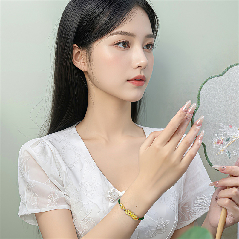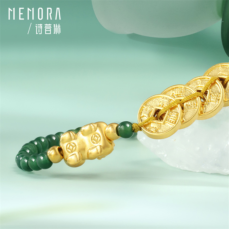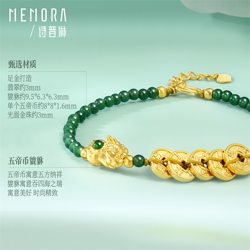 【新品】诗普琳 足金黄金五帝钱貔貅镶嵌翡翠手链 金镶玉送女礼