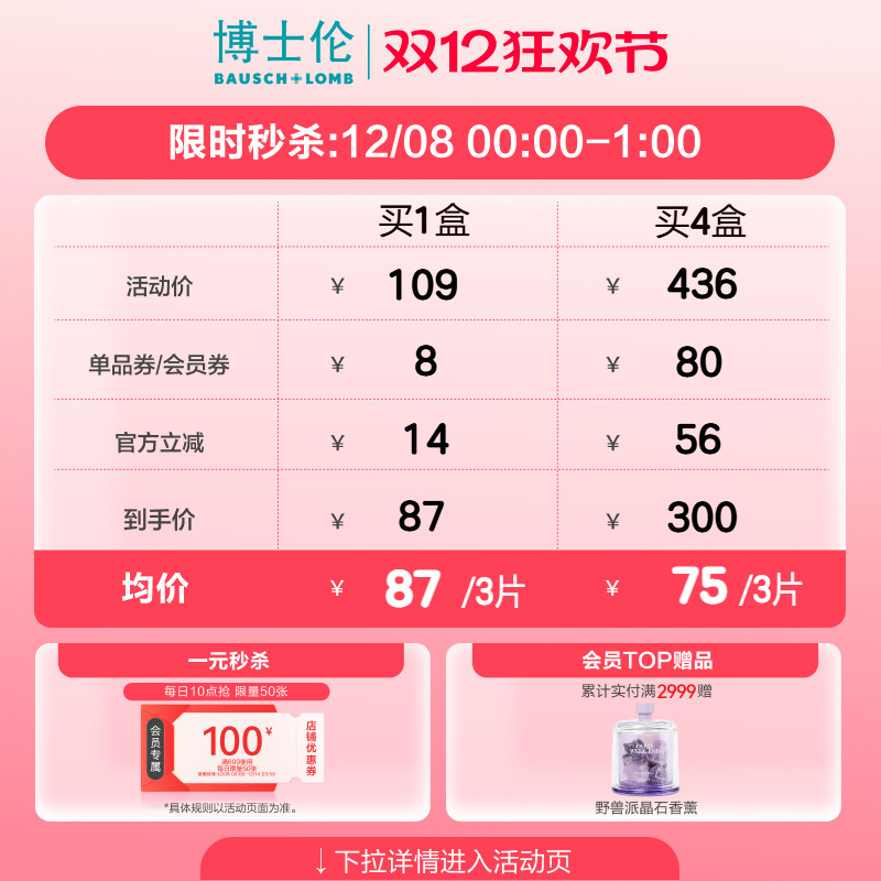 [买4赠4]博士伦官方纯视2代硅水凝胶月抛近视隐形眼镜透明水润