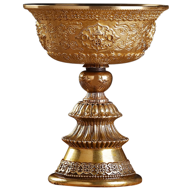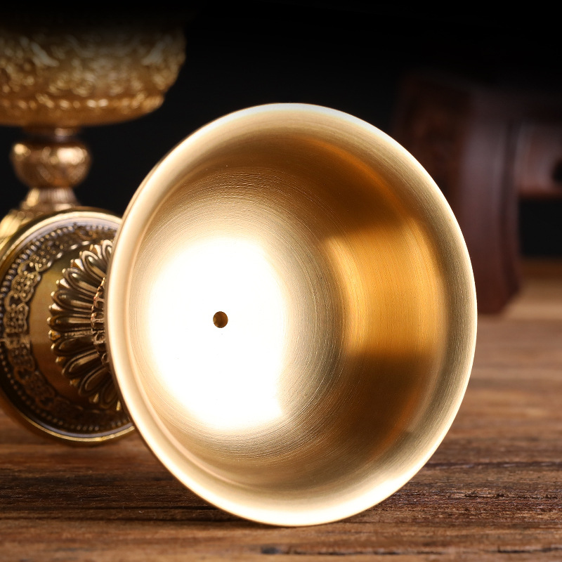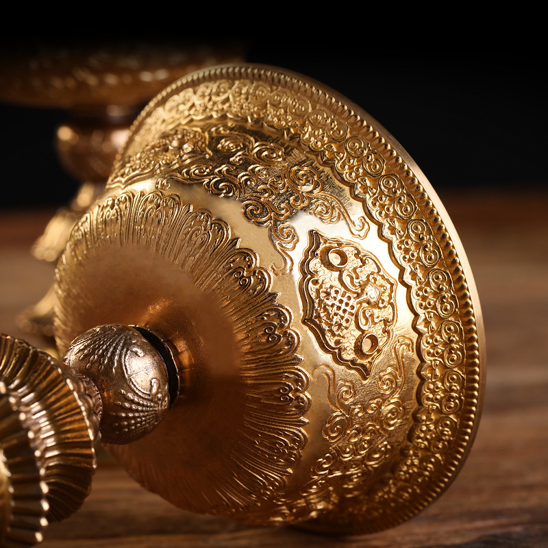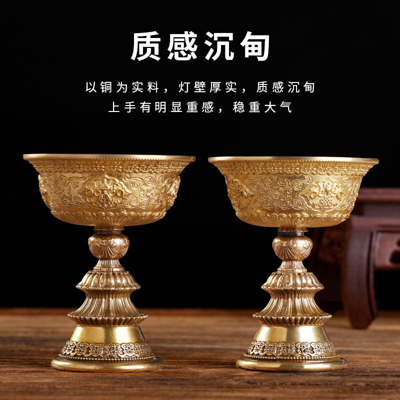黄铜酥油灯座家用固液体两用长明灯浮雕八吉祥高脚烛台中号摆件