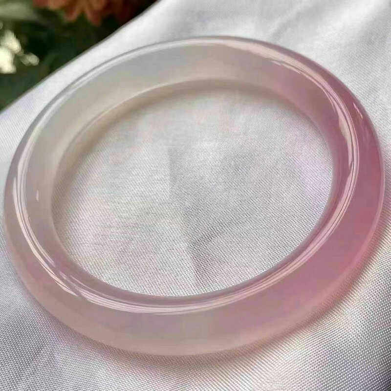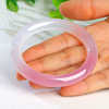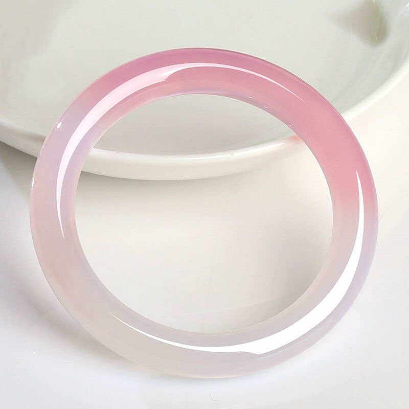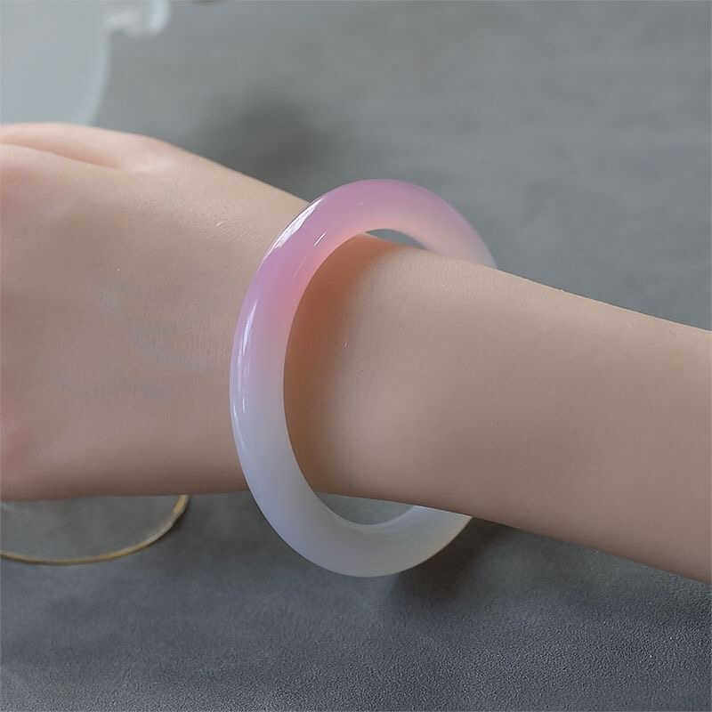 天然冰种玉髓手镯女款半粉半白色玛瑙玉石樱花粉渐变胖圆条镯子