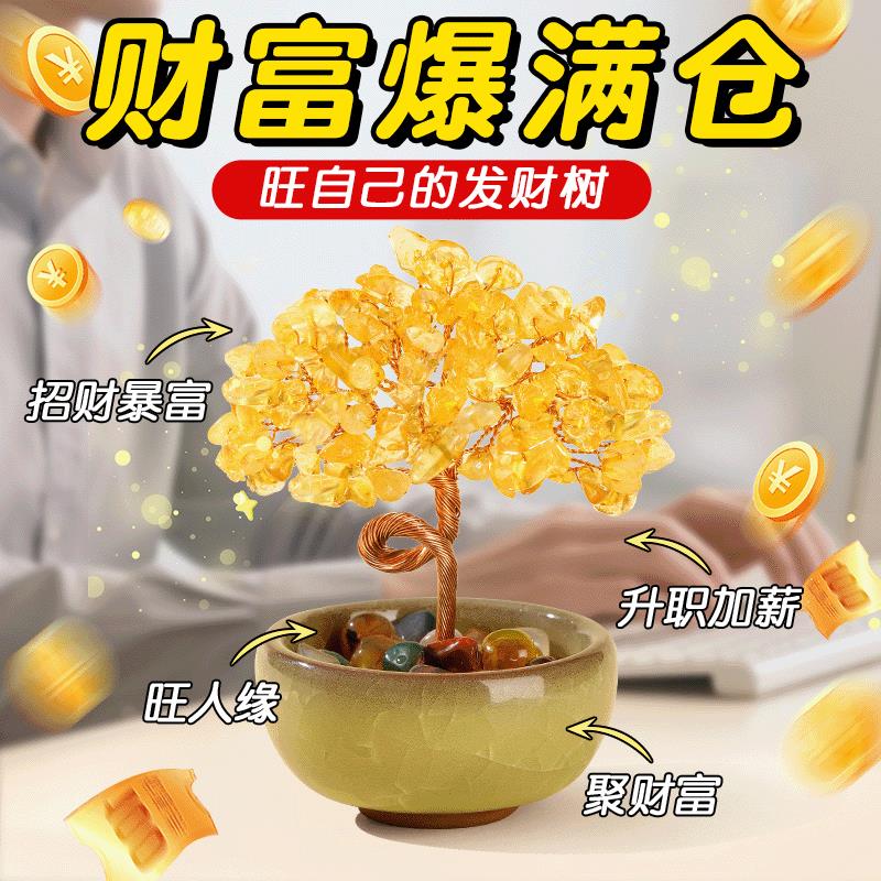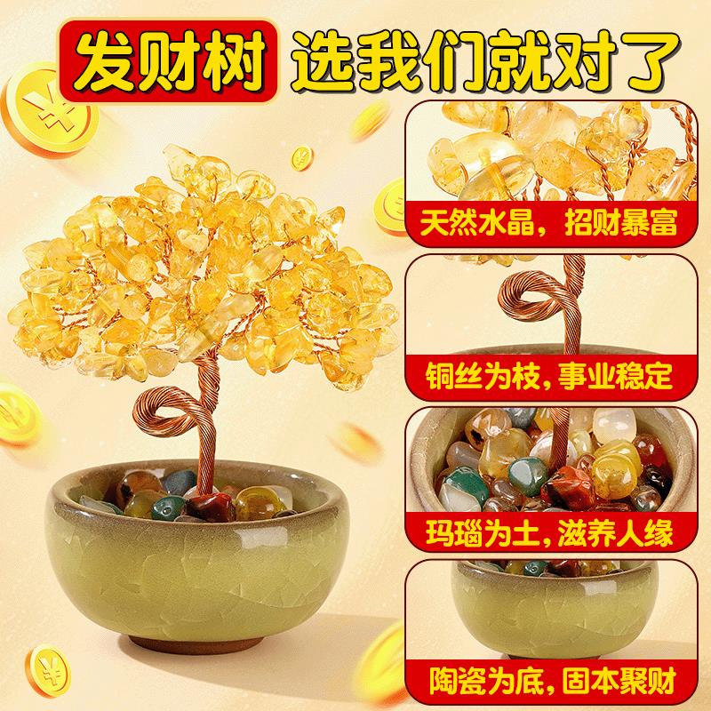 普陀山天然黄水晶招财树摆件发财摇钱树家居办公室工位桌面装饰品