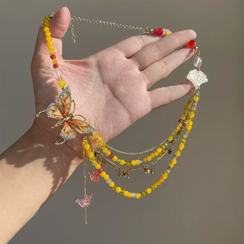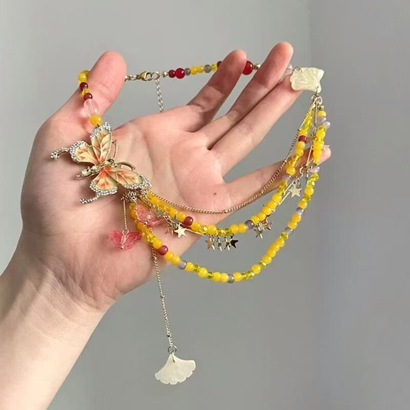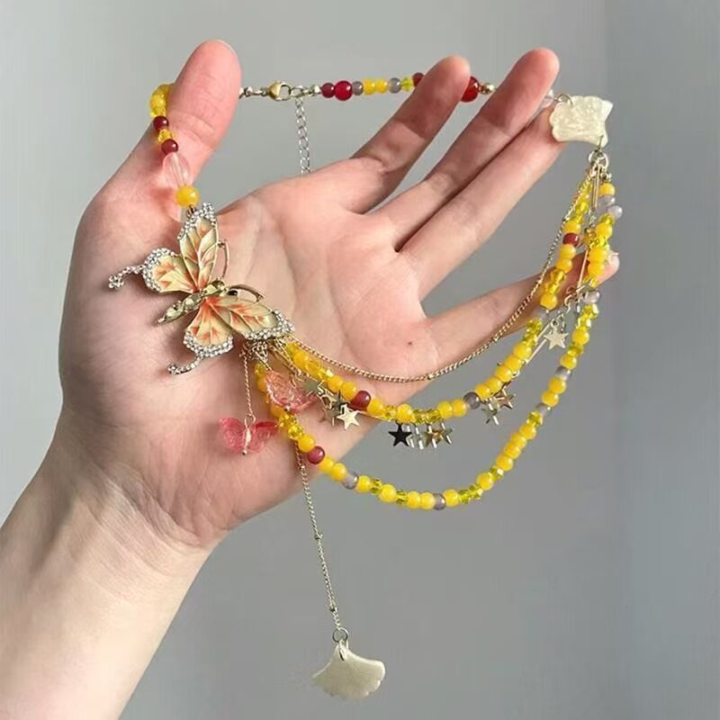 黄色滴油蝴蝶串珠银杏叶流苏项链春夏辣妹甜叠戴锁骨链女款多层