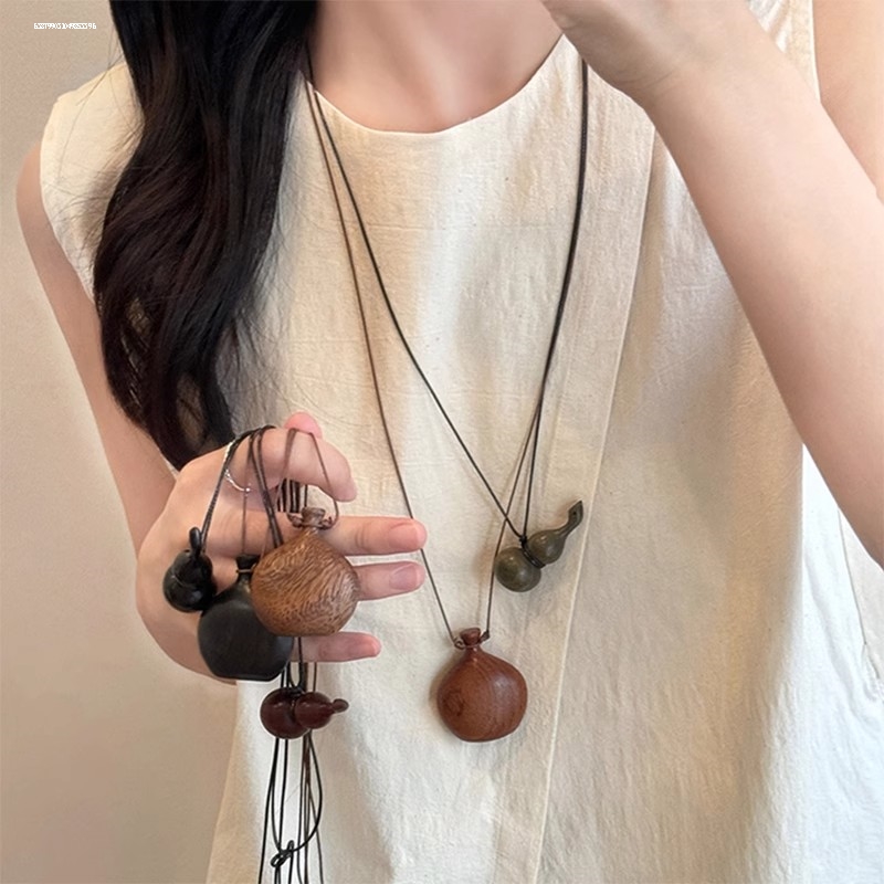 木质葫芦黑色皮绳长款项链女小众设计感情侣毛衣链简约百搭配饰潮