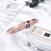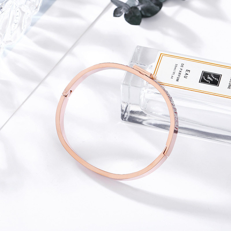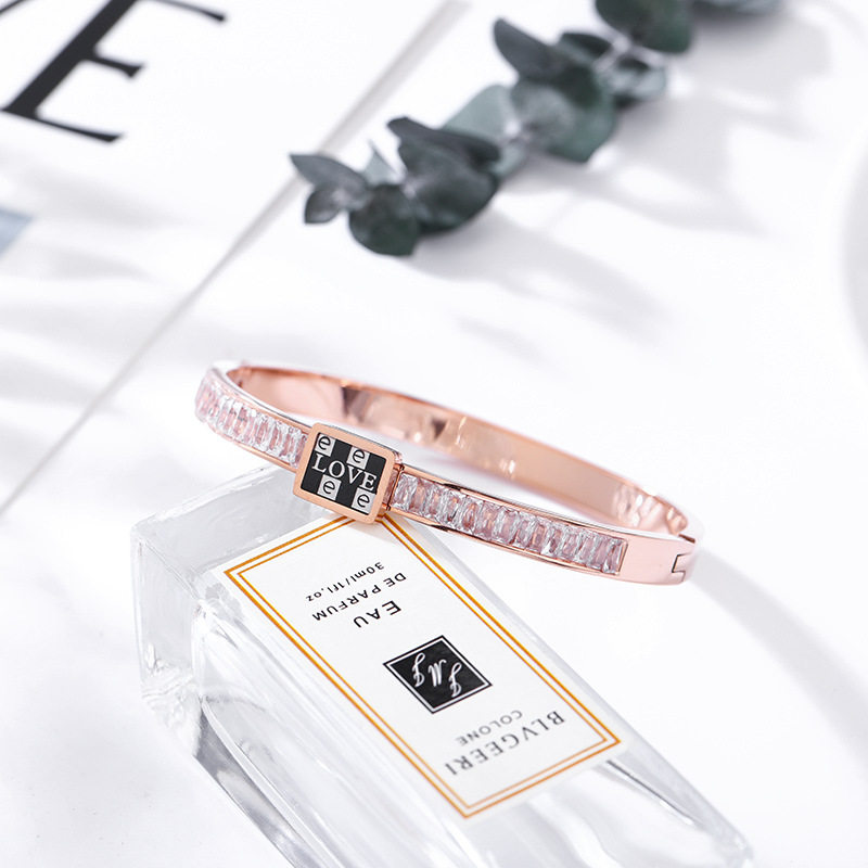 简约半圈白锆石手镯女 钛钢玫瑰金love黑白格手环开口情侣首饰
