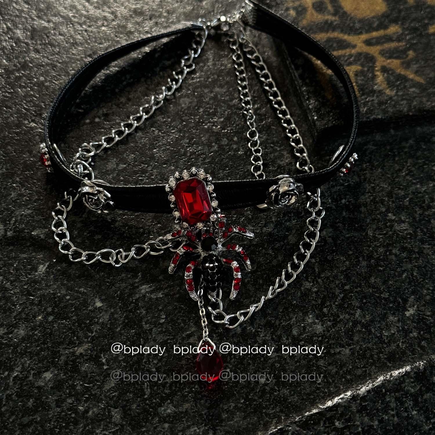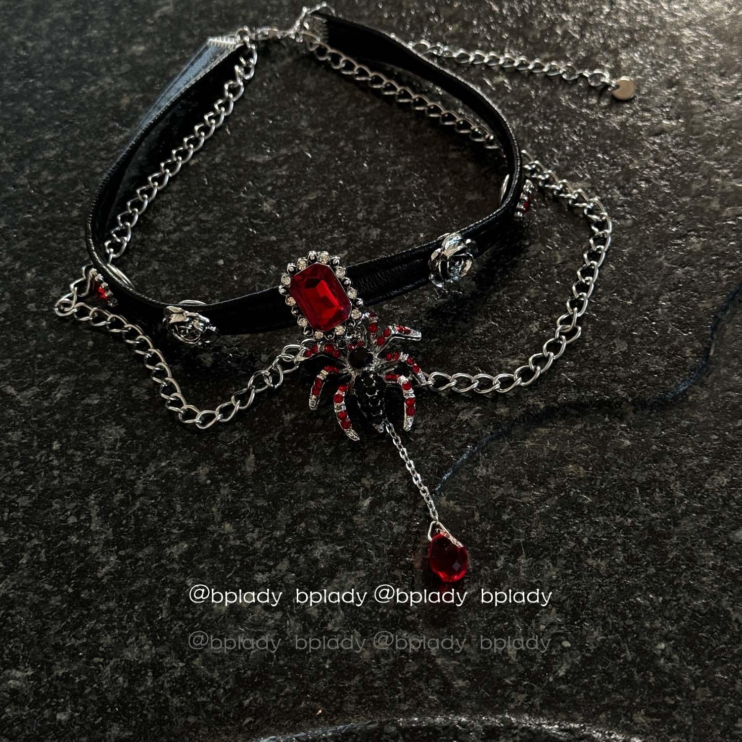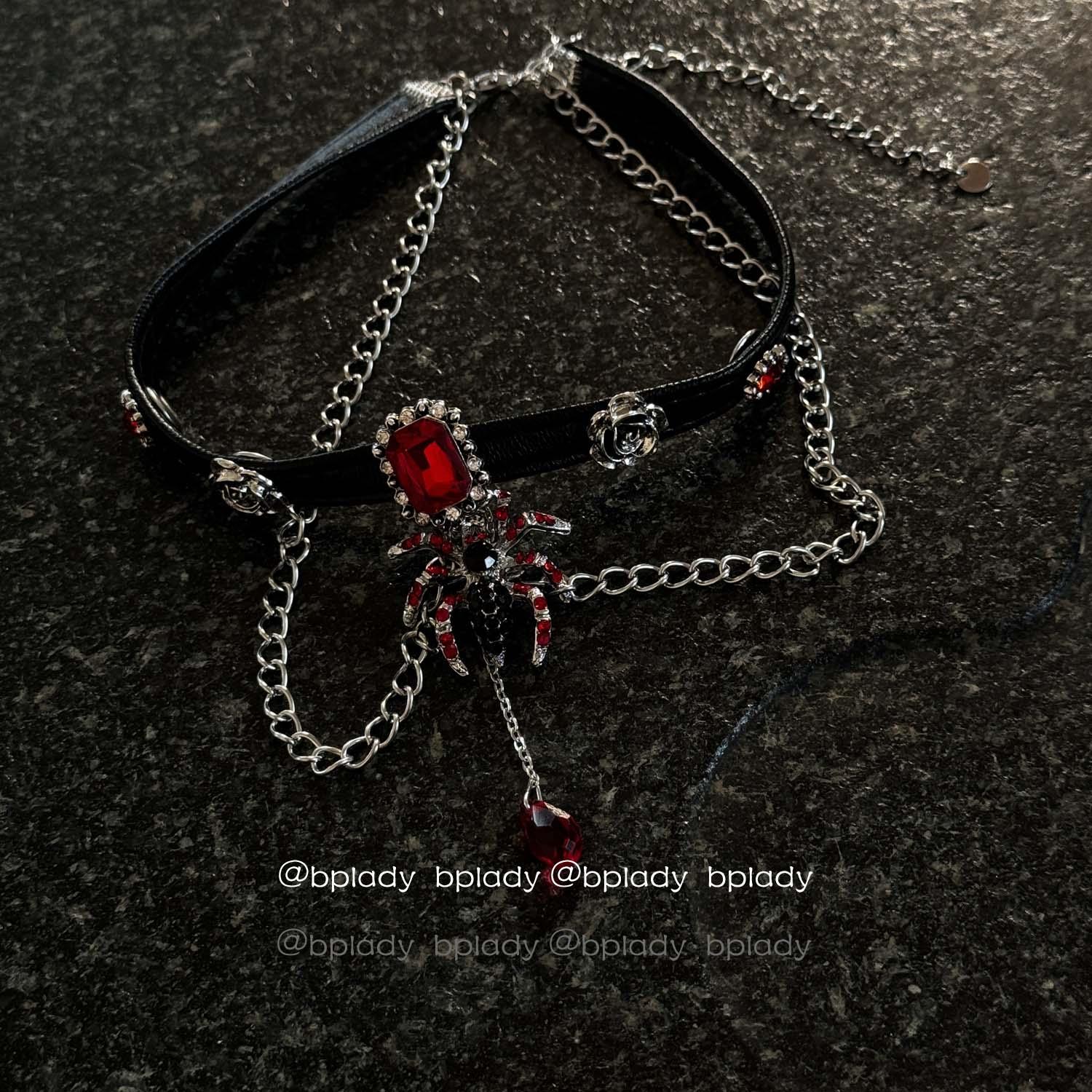 甜酷辣妹风红色方钻蜘蛛项链女choker脖子配饰颈环项圈精致高级