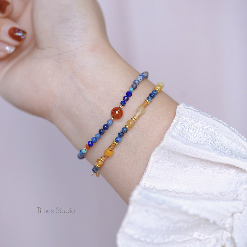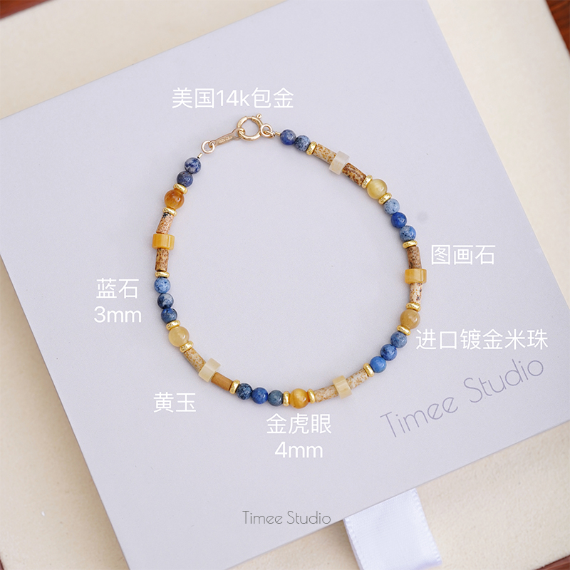 Timee恬觅 秋慕 天然蓝石黄玉金虎眼图画石14K美包手链