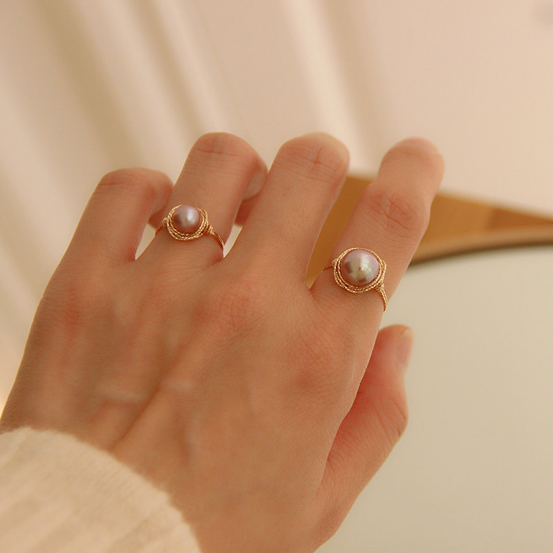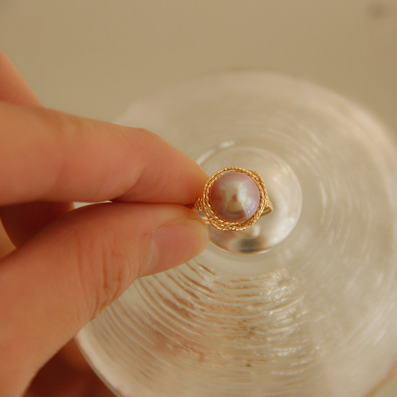 天然浅紫色珍珠戒指女麻花绕线淡水珍珠指环14k包金超强保色原创