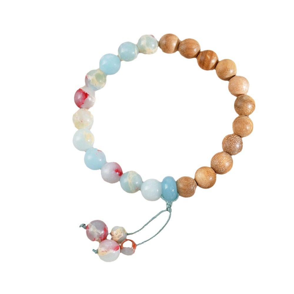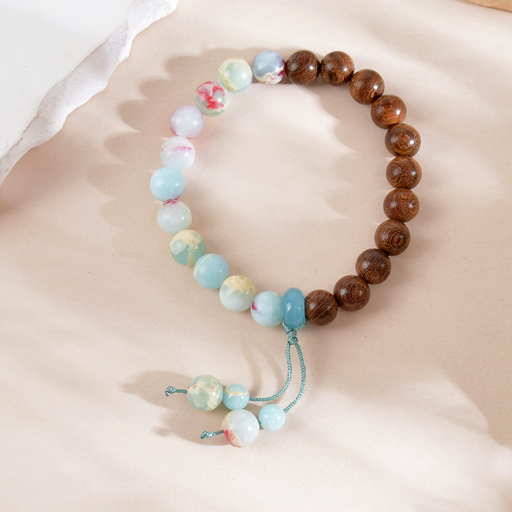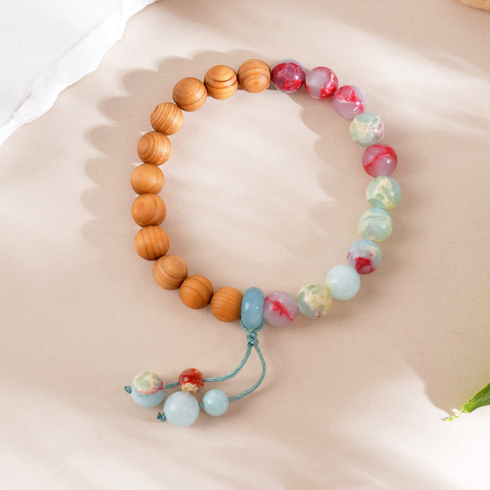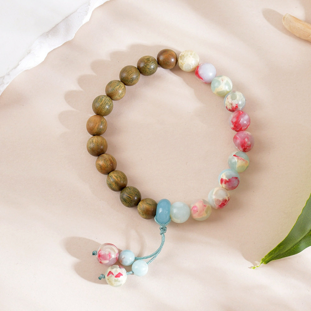 新款天然雨花石寿山石手串新中式檀木手链女手工木质复古彩色饰品