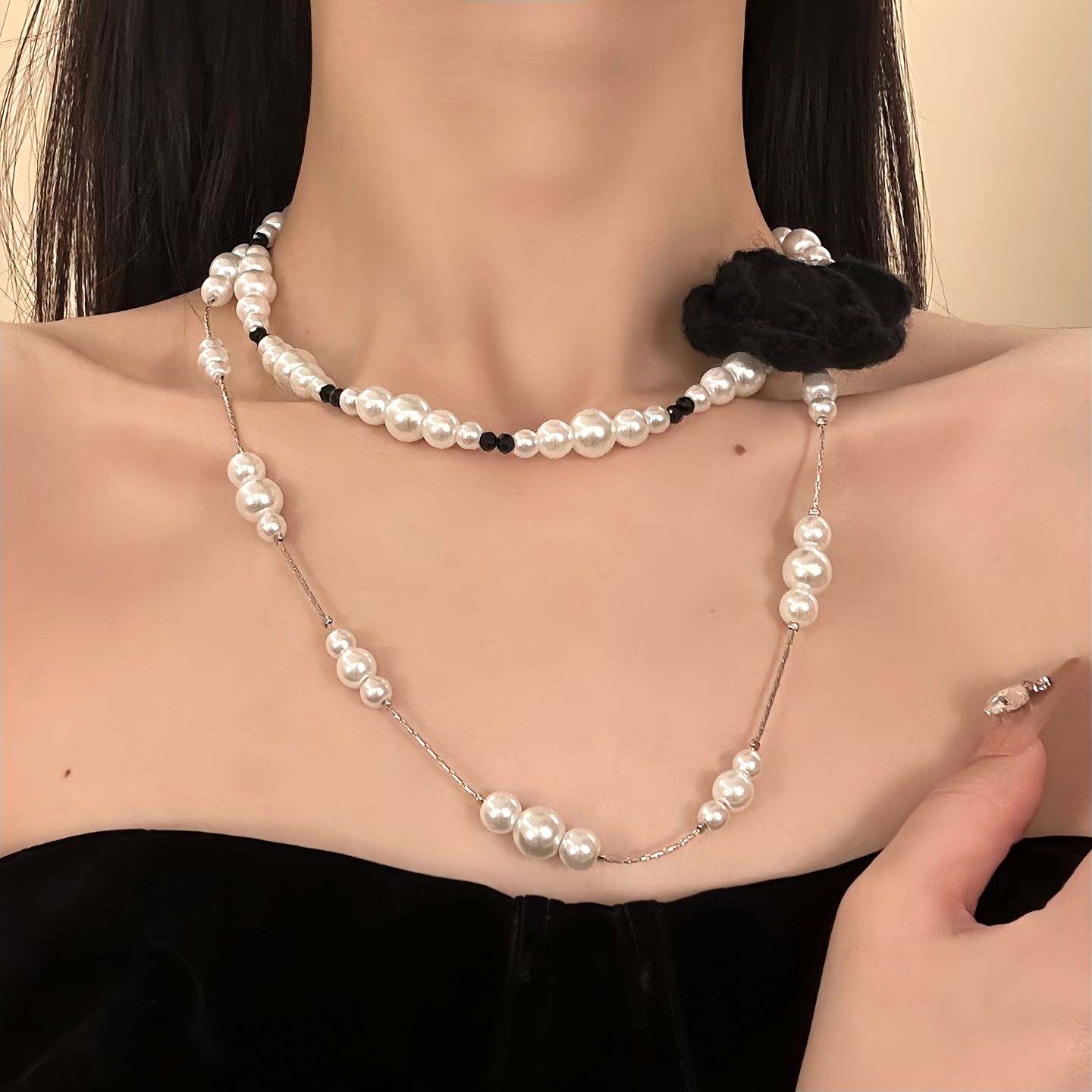 HEY TAO复古黑色毛线花朵珍珠项链女小众双层叠戴颈链配饰毛衣链