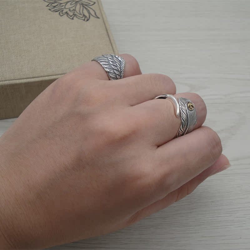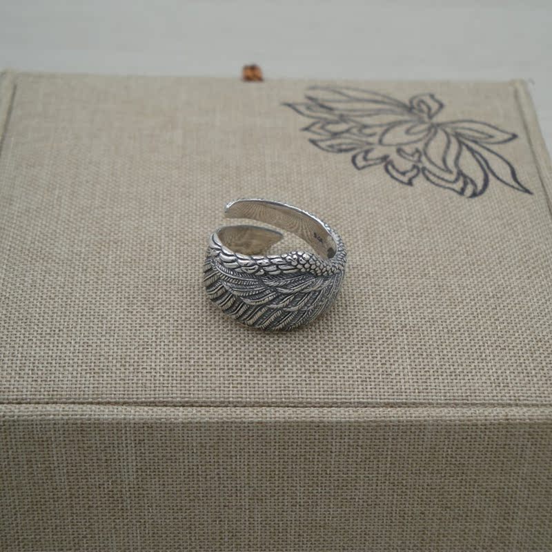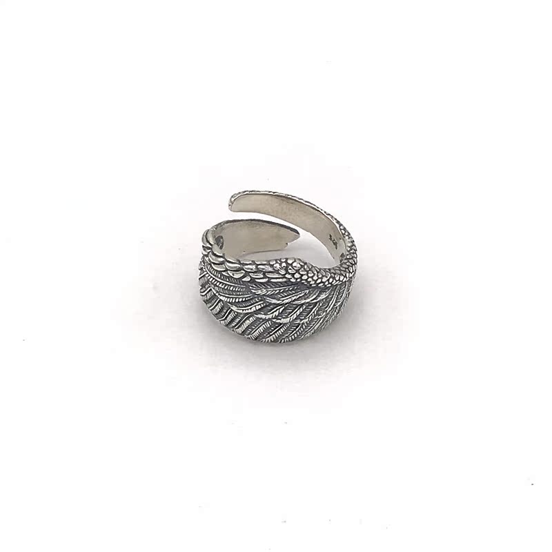 戒指女时尚个性简约S925纯银复古开口羽毛指环翅膀泰银潮流饰品