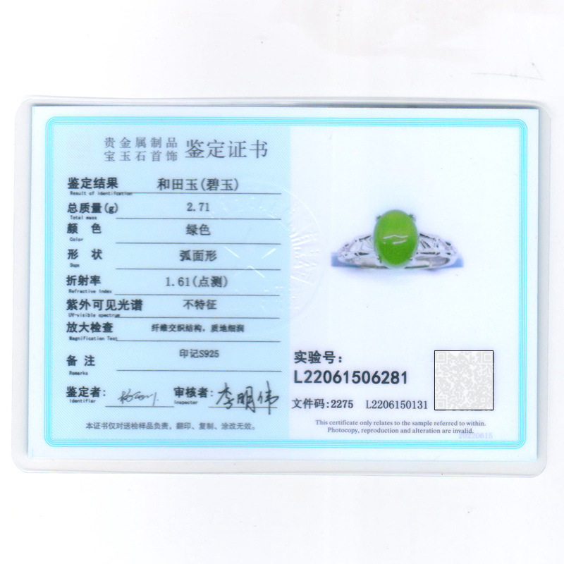 带蛋面碧玉戒指 复古国风竹叶开口可调节925银绿色玉石女戒